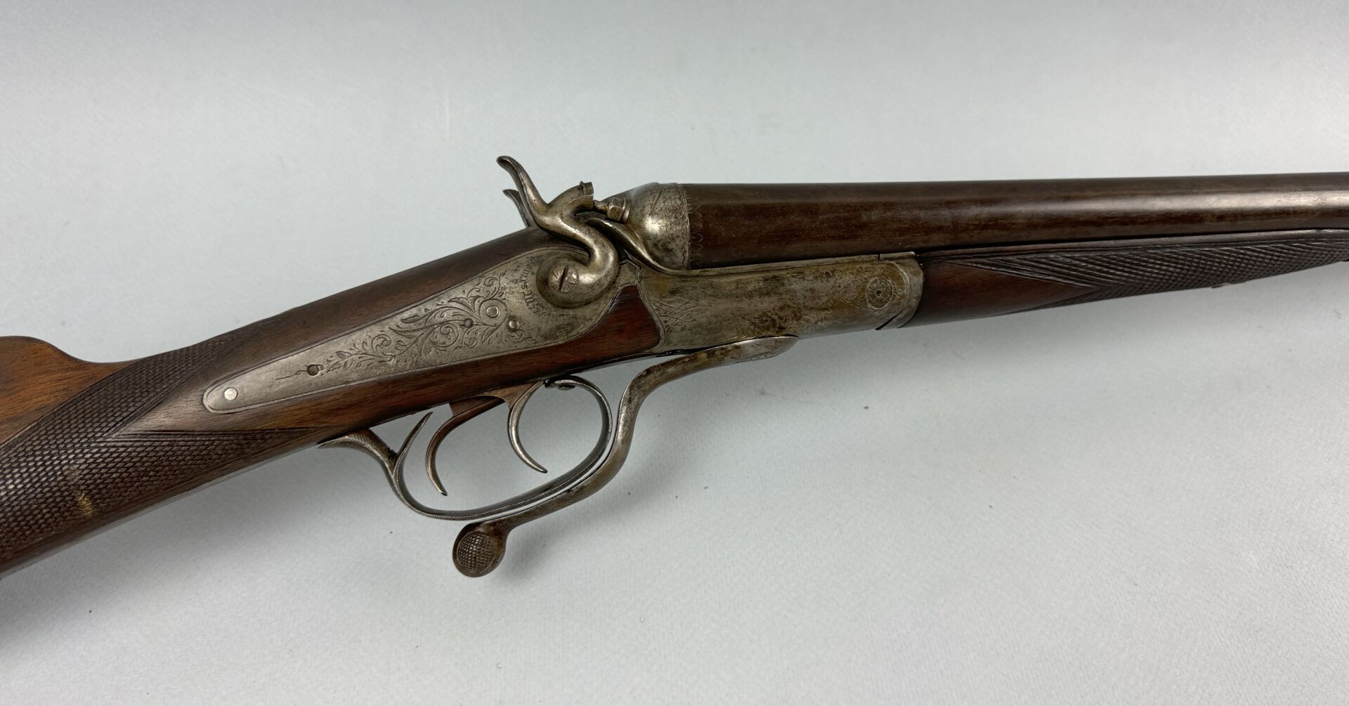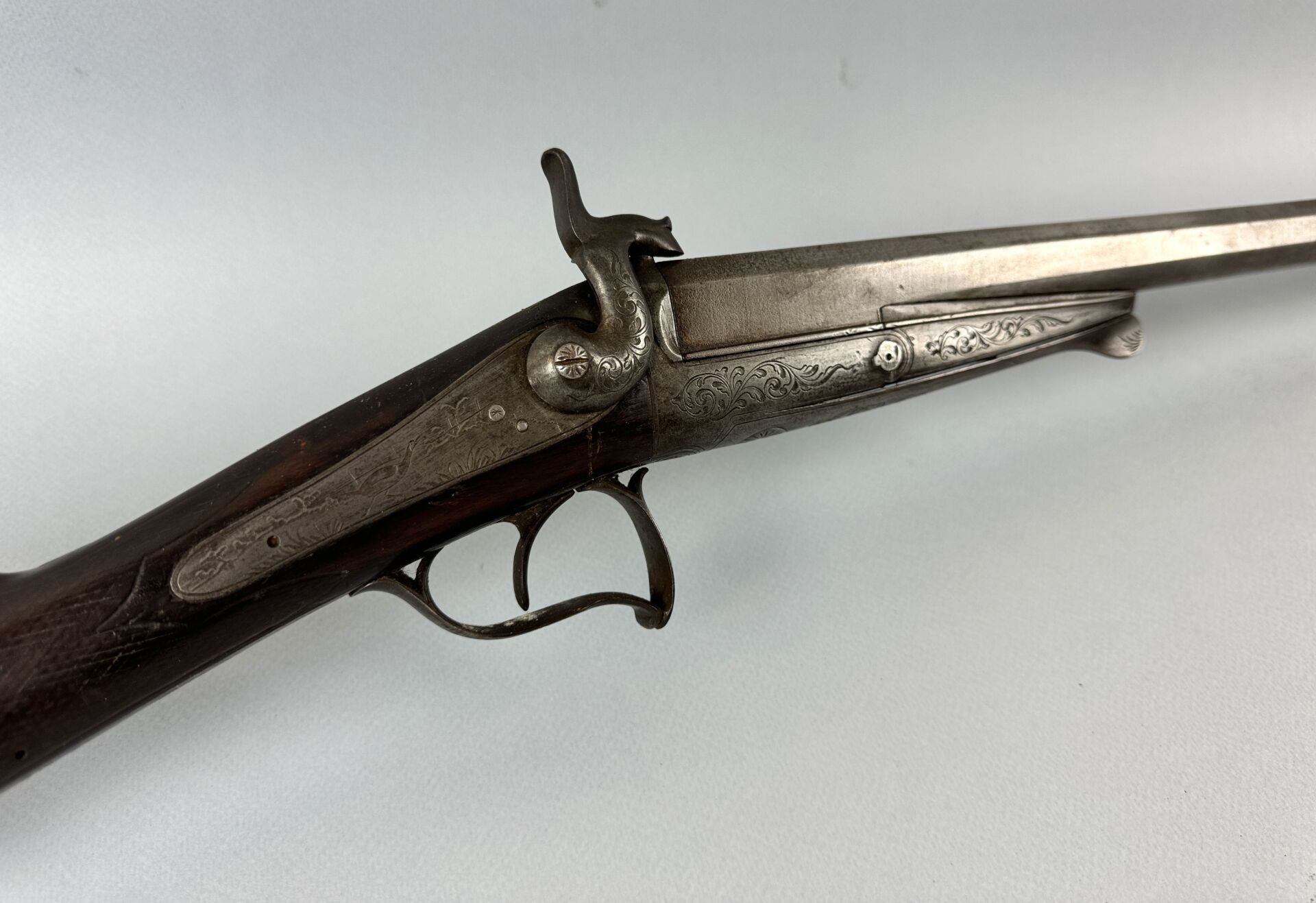 Joli fusil juxtaposé artisanal, fabrication stéphanoise vendu par la maison Courty à Paris, canons juxtaposés calibre 12/70 à éjecteurs, alésage 18.4 mm, de 710 mm de long, fabrication Jean Breuil à Saint Etienne, bascule allégée, entaillage forgeron, piston étroit, trempe grise, gravure florale, signature "Courty