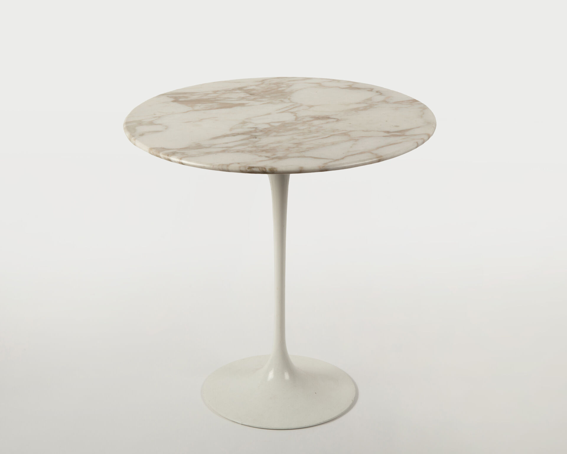 Eero SAARINEN (1910-1961) - Knoll international Éditeur Guéridon "Tulip" en fonte recouvert de rislan blanc et plateau de marbre blanc veiné H : 51 - D : 51 cm