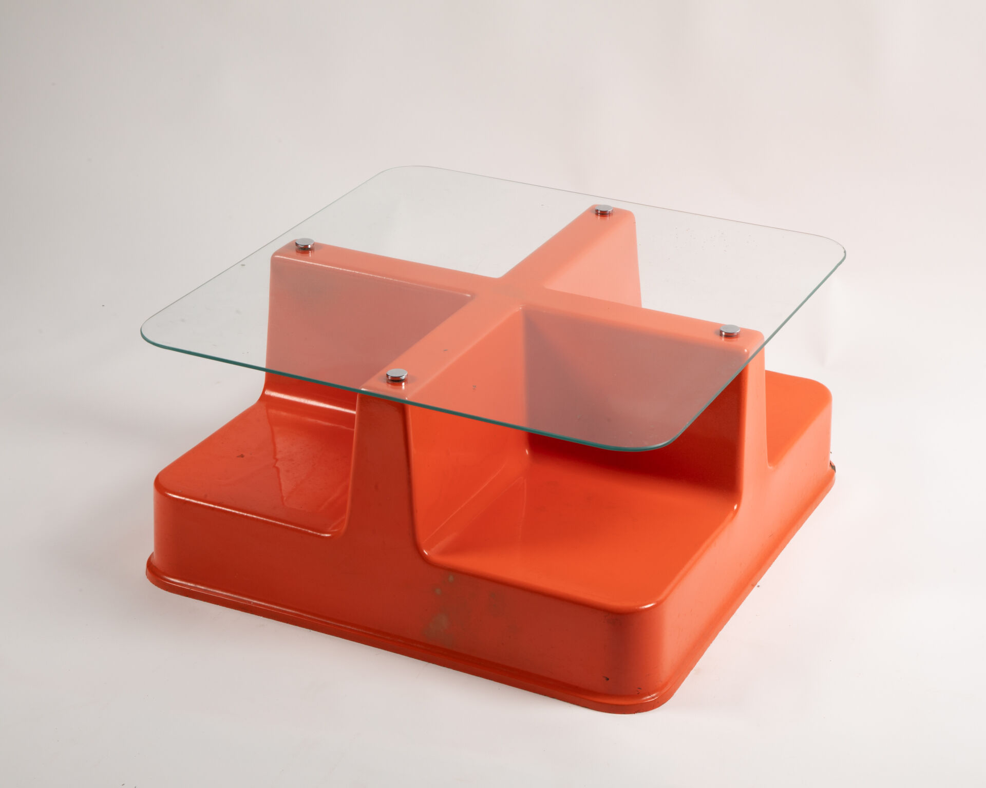 Table basse carrée à structure en fibre de verre orange, plateau de verre à bords arrondis Travail des années 1970 Accidents et graffitis H : 34 - Coté : 70 cm