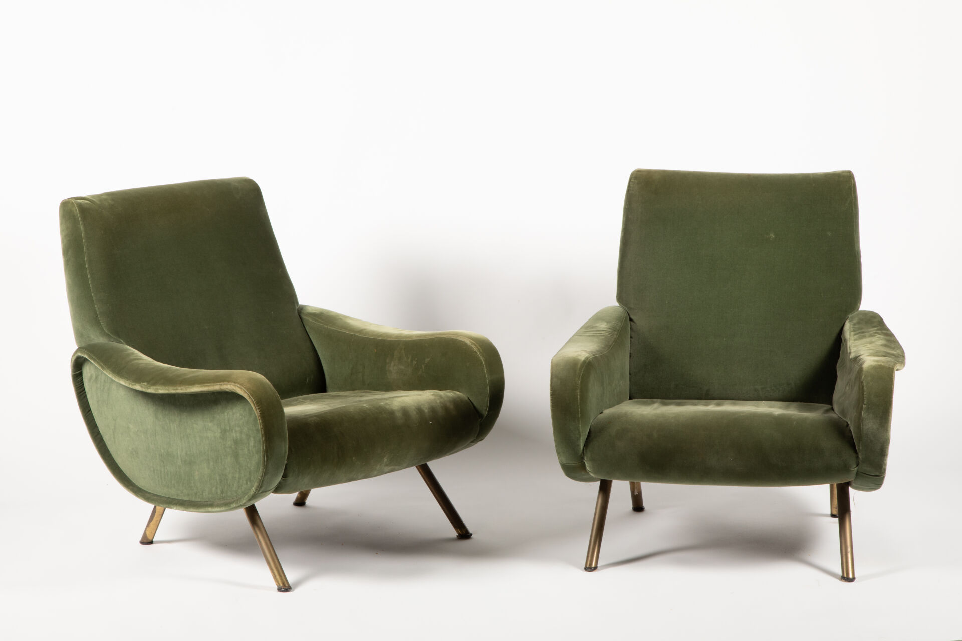 Marco ZANUSO (1916-2001) Paire de fauteuils modèle Lady tendus de velours vert reposant sur quatre pieds tubulaires en laiton. Usures au velours H : 79 - L: 77 - P : 78 cm
