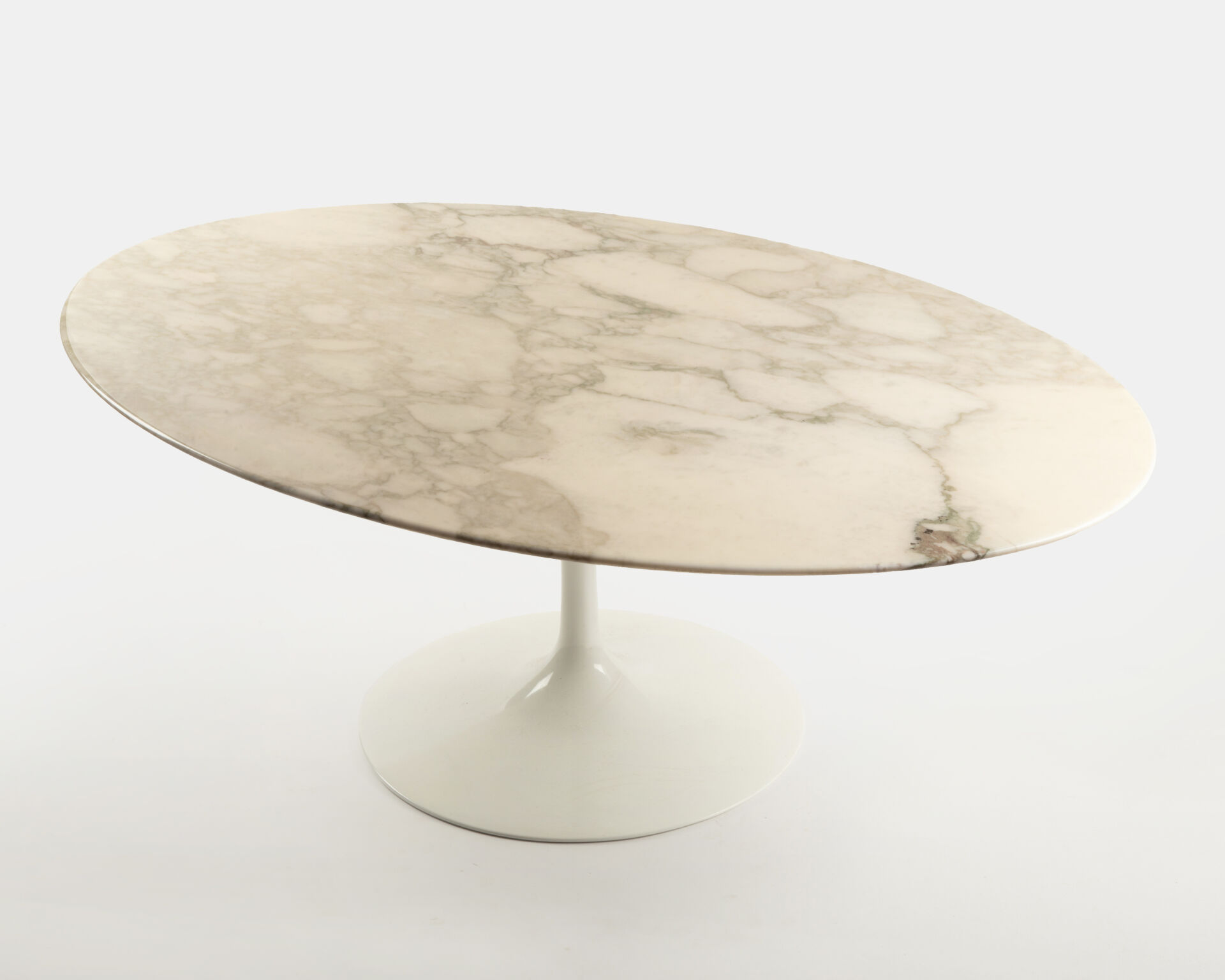 Eero SAARINEN (1910-1961) - Knoll International Éditeur Modèle « Tulip Coffee », créé en 1957 - Table basse à plateau ovale en marbre blanc veiné, piètement en fonte recouvert de rislan blanc H : 38 - L : 107 - P : 70 cm