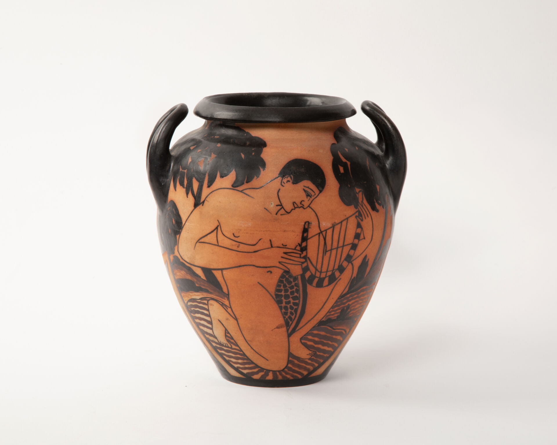 CIBOURE V.E. Période VILOTTE (1922-1945) Circa 1925 Vase amphore à deux anses en grès à décor néo-grec tournant représentant un couple bachique. Marque au tampon "VE Ciboure" sous la base Hauteur : 25 cm.