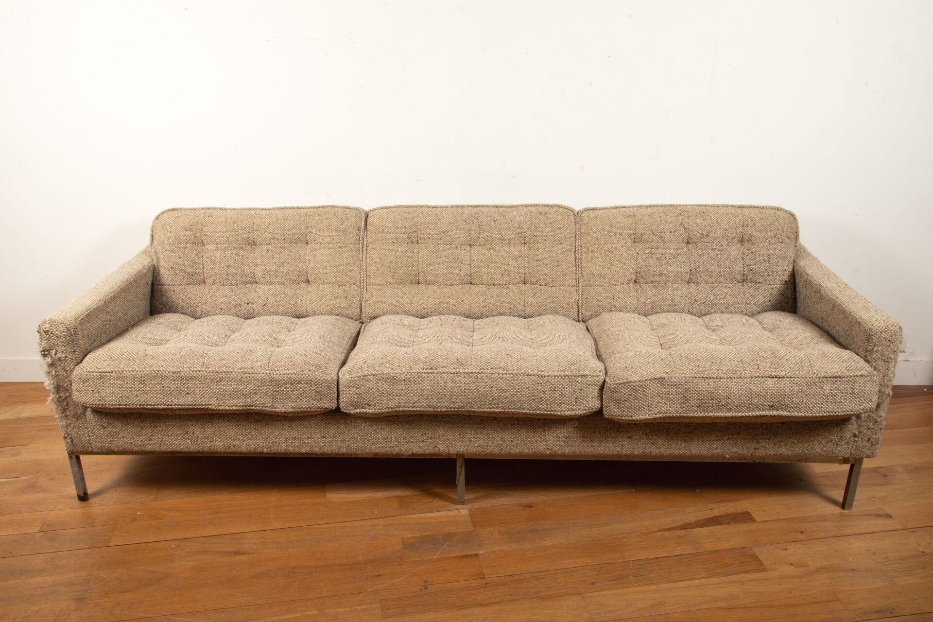 Florence KNOLL (1917-2019) - Édition Knoll Canapé trois places modèle "2556", piétement en métal chromé, garniture de lainage gris chiné capitonné Usures, griffures importantes aux angles - Traces de rouille au piètement H : 72 - L : 228 - P : 87 cm