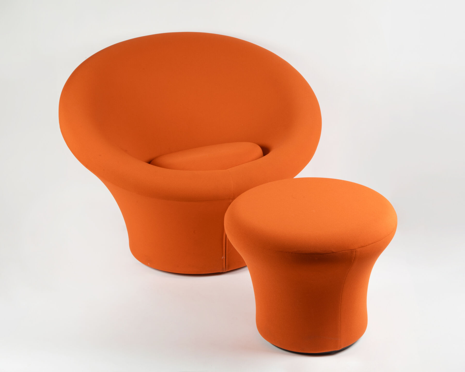 Pierre PAULIN (1927-2009) - ARTIFORT Éditeur Fauteuil et son ottoman modèle F560 dit "Mushroom", couverture de tissus orange. Plaque de l'éditeur sous la base Tâches H. Fauteuil : 68 cm