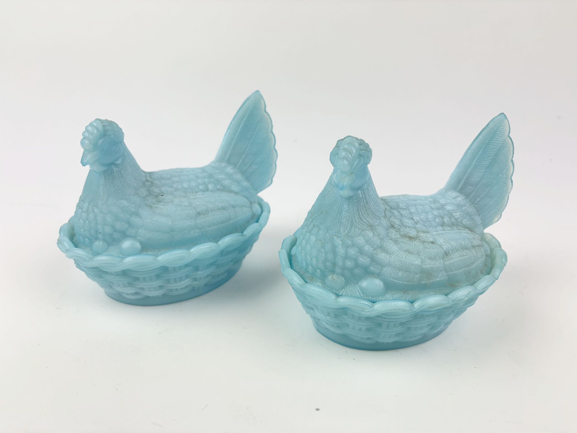 Paire de beurriers en opaline de foire bleu à décor de poule dans un panier H : 10 - L : 14 - P : 10 cm
