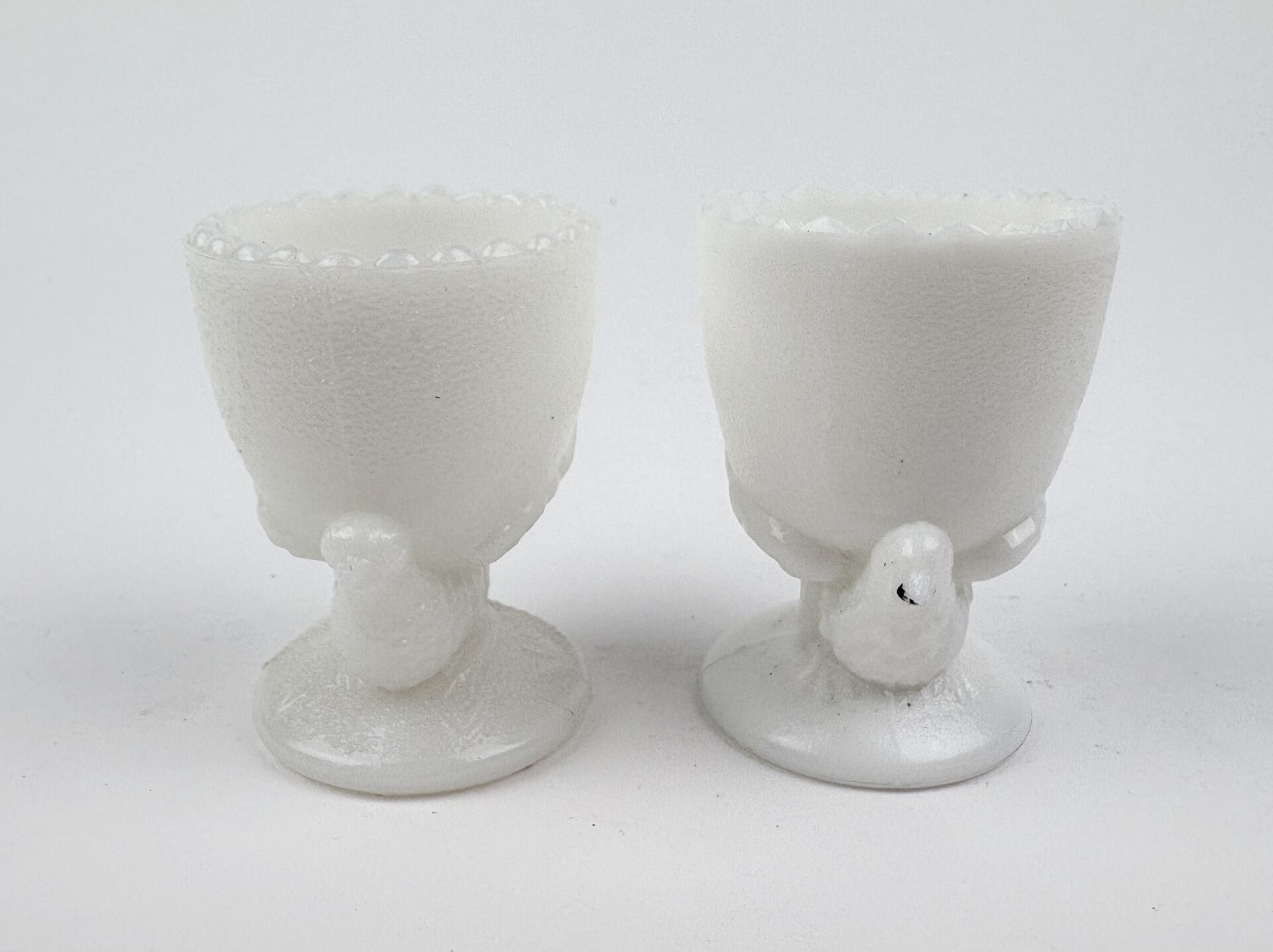 Deux coquetiers en opaline de foire blanche à décor de poussins H : 6.5 cm