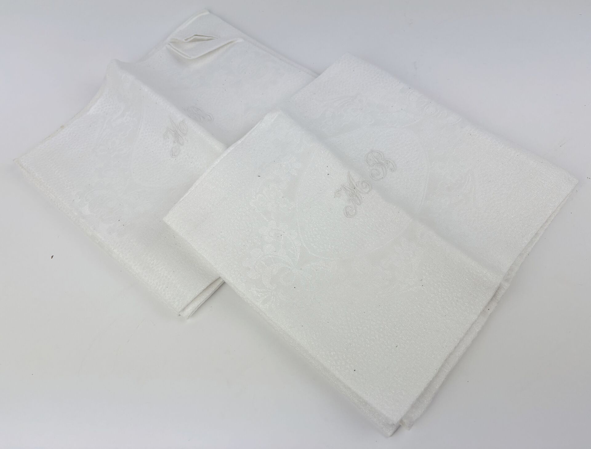 Nappe et 6 serviettes en coton damassé à motif floral sur fond vermiculé, chiffres brodés "MB"