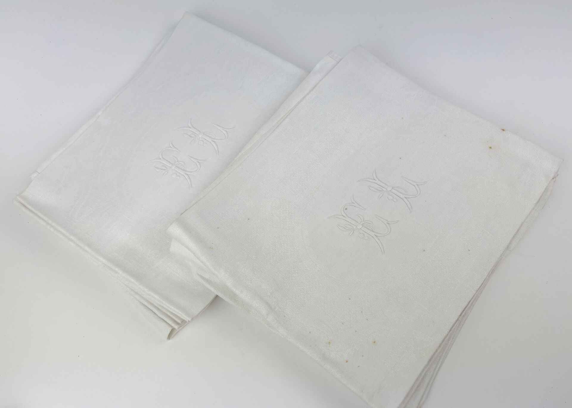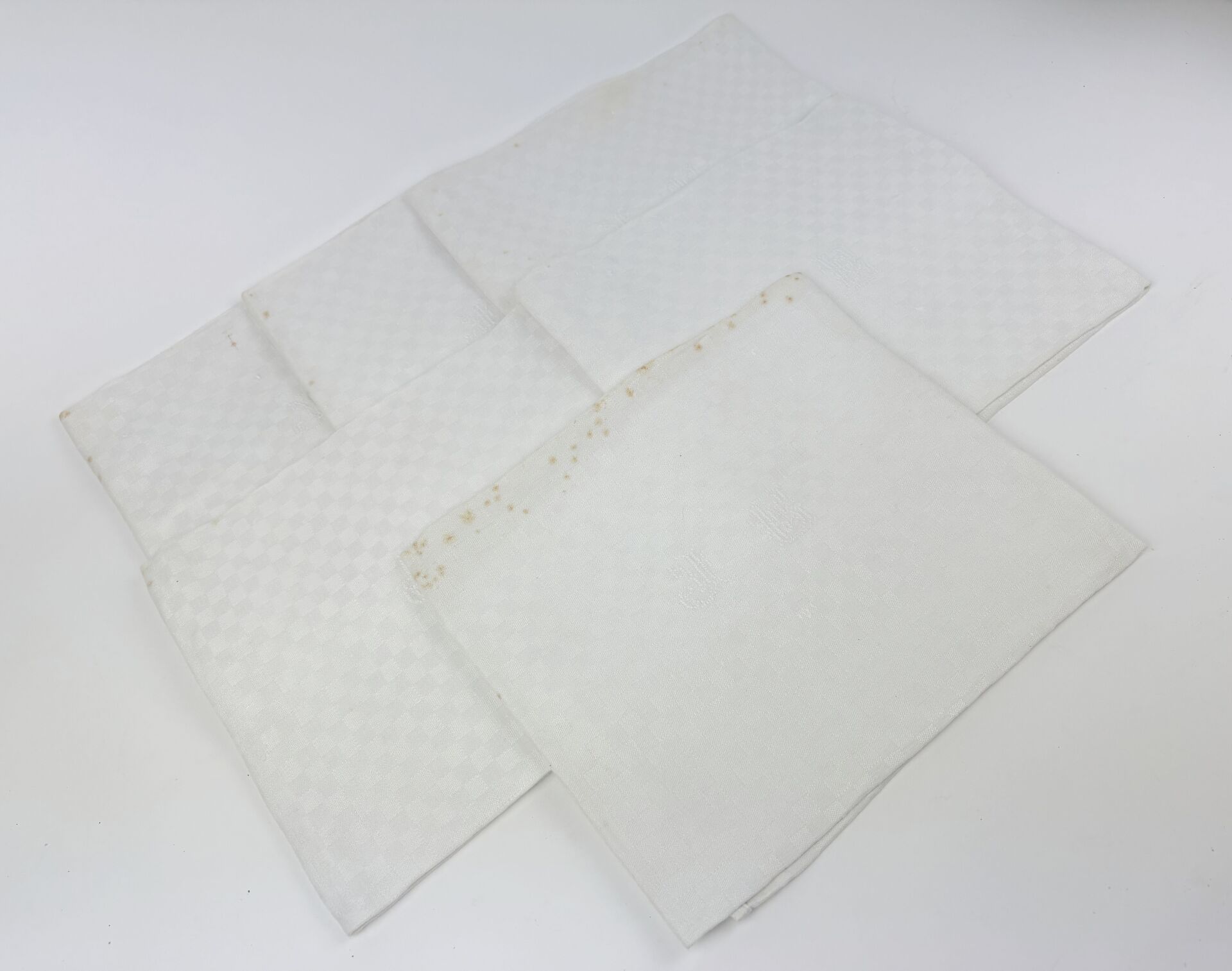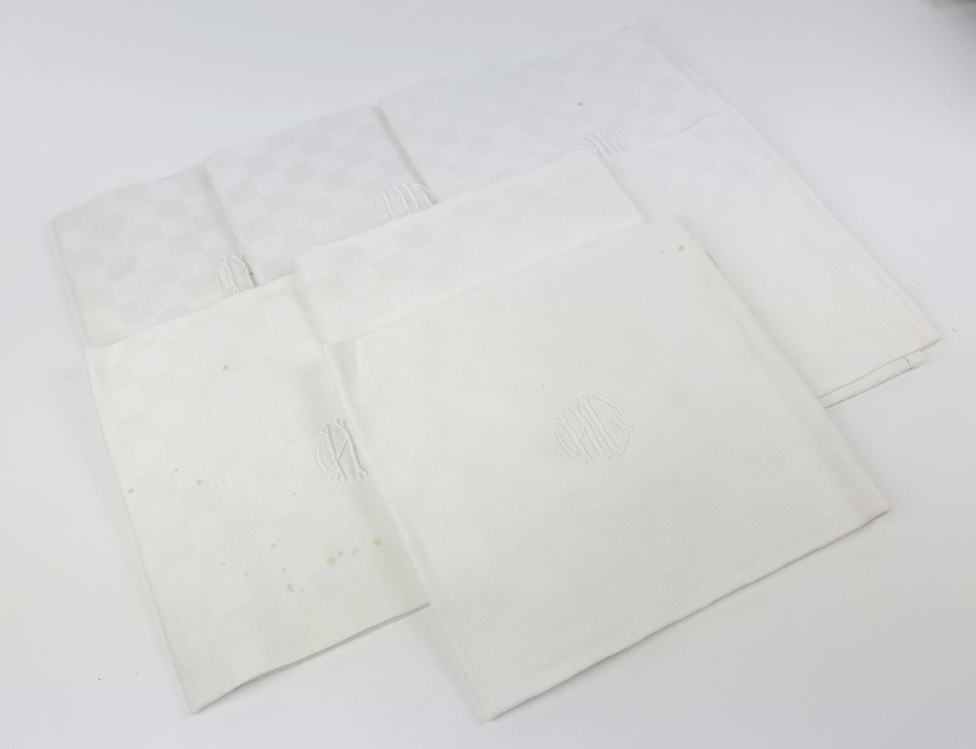 Suite de 12 serviettes en coton damassé à décor de damier chiffrées "JE" Tâches de rouille