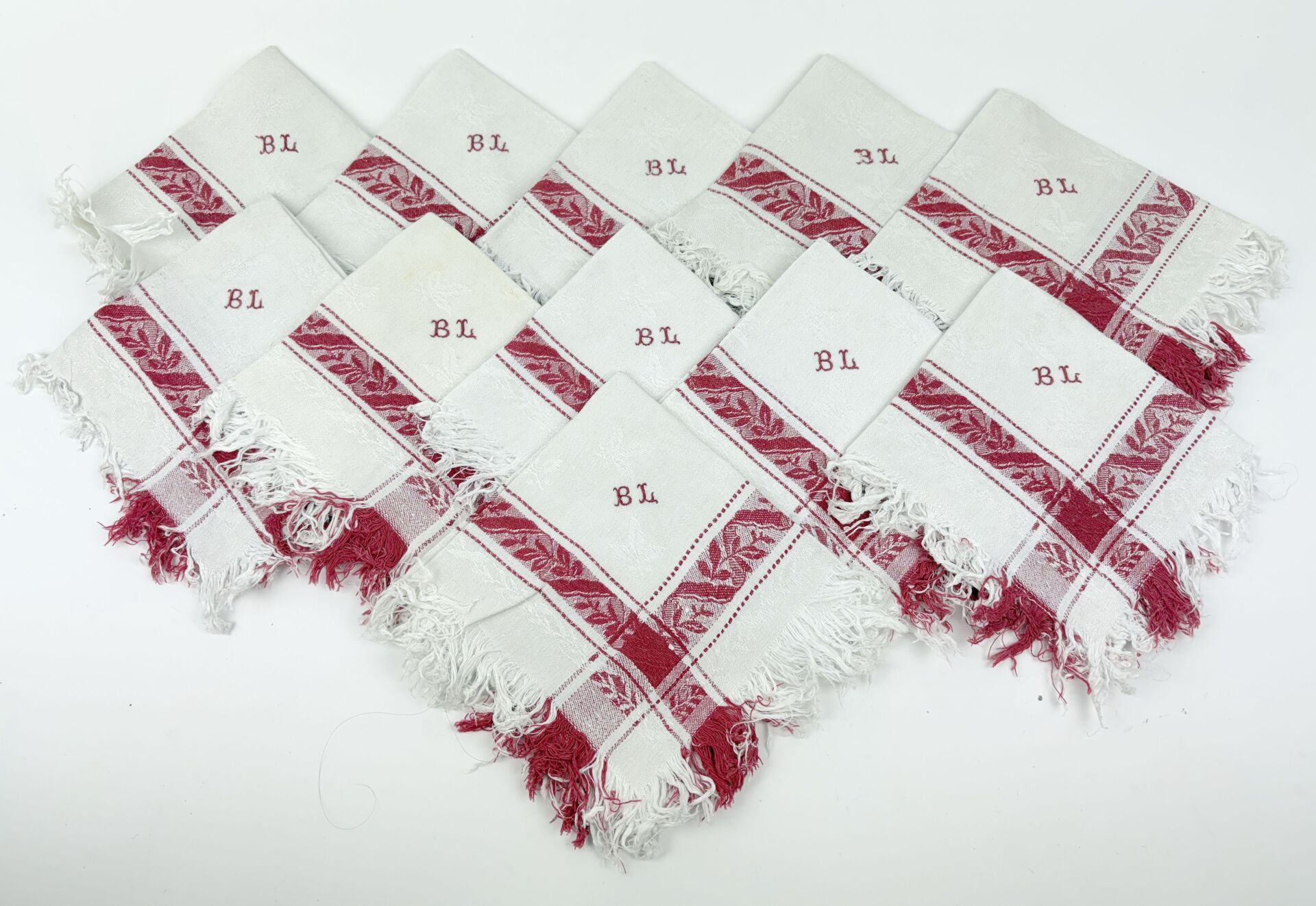 Suite de onze serviettes à thé en coton damassé rouge et blanc à décor de rubans et guirlandes de laurier, bord frangé chiffrées "BL" 28 x 28 cm