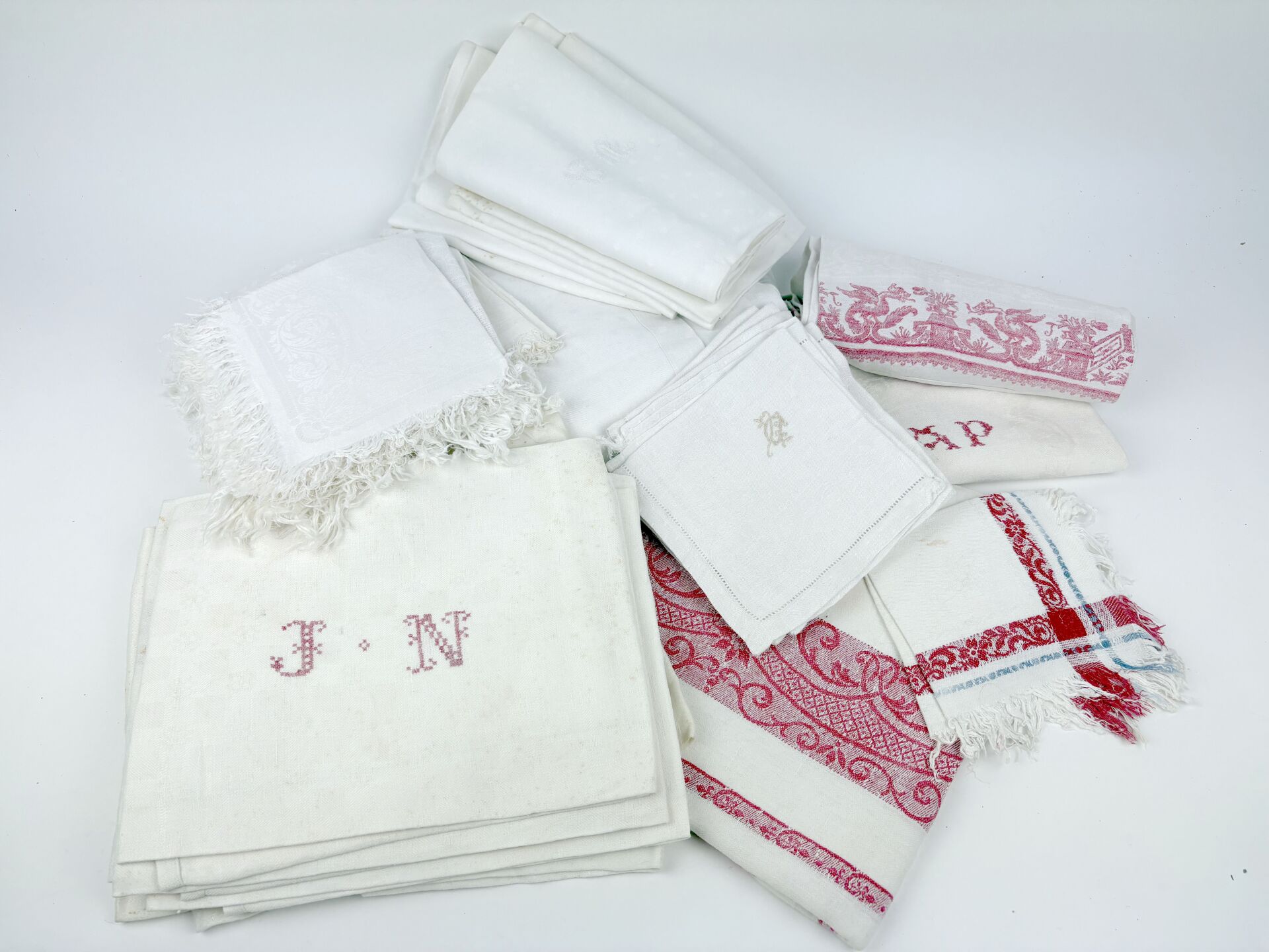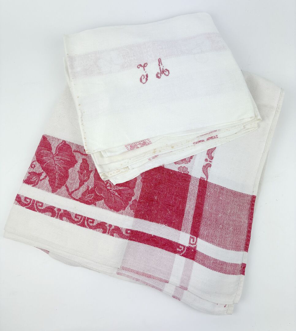Lot de quatre nappes et douze serviettes dépareillées en coton damassé uni ou blanc et rouge, toutes chiffrées