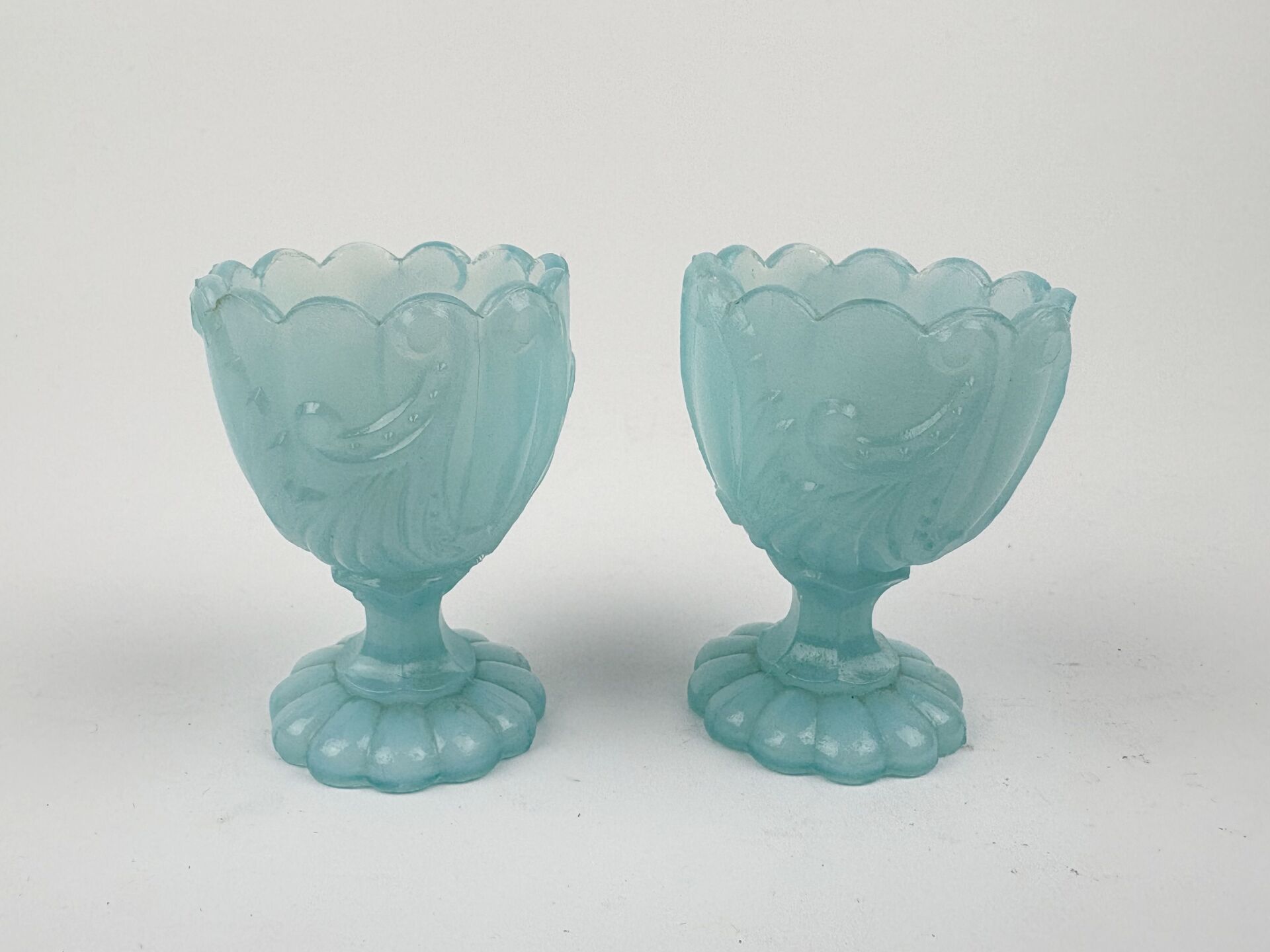 PORTIEUX Paire de coquetiers en opaline polylobée bleue à décor de rinceaux H : 6.5 cm