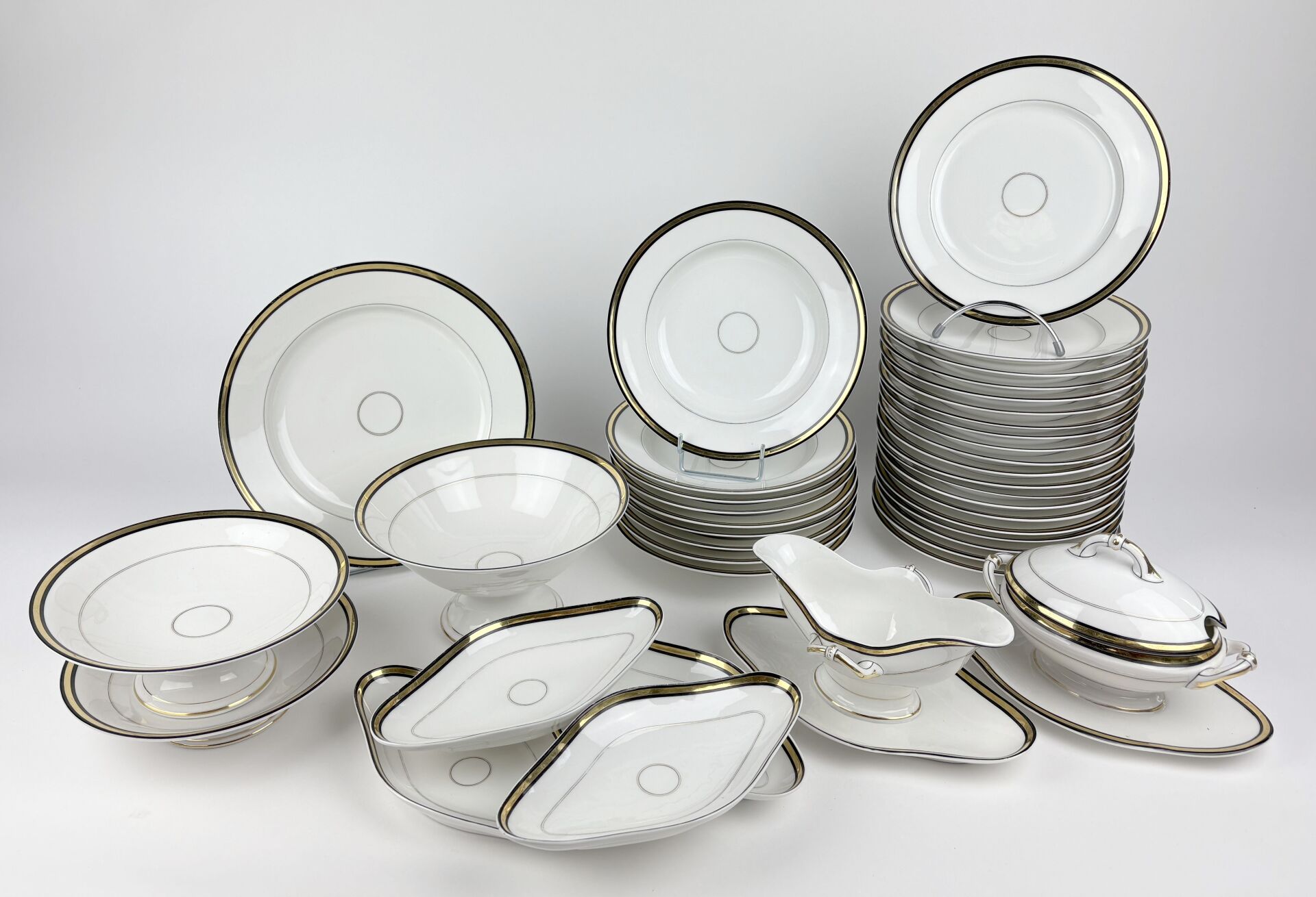 VIEUX PARIS Partie de service de table en porcelaine blanche à décor de large filet doré encadré d'un double filet noir comprenant : - 20 Assiettes plates - 9 Assiettes creuses - 1 Plat creux - 2 Compotiers - 1 Coupe sur talon - 1 Saucière