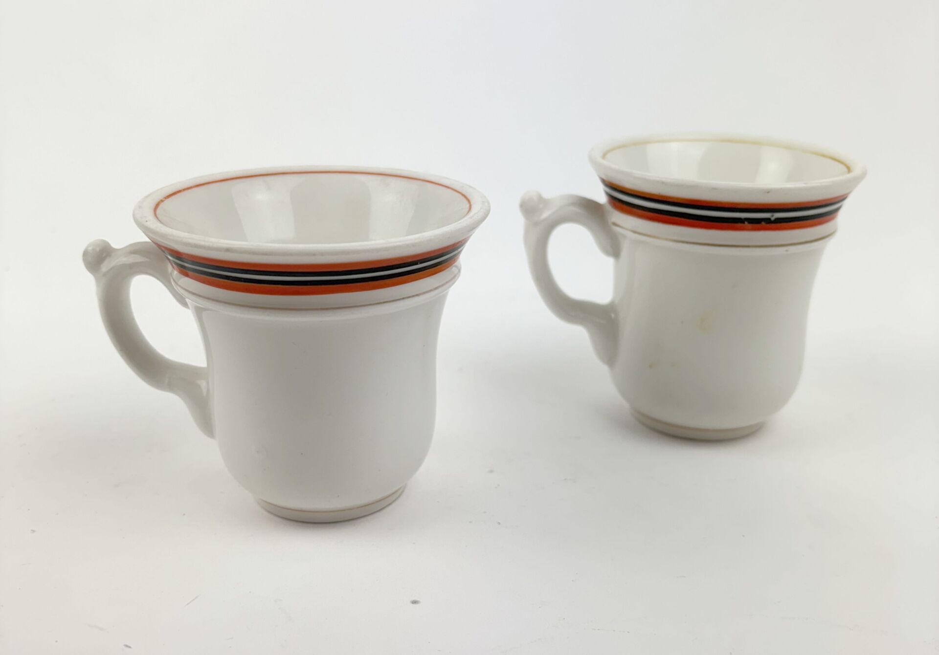 PARIS Paire de brulots en porcelaine blanche à décor de filets orange, noir et or Usures au décor H : 8.2 cm