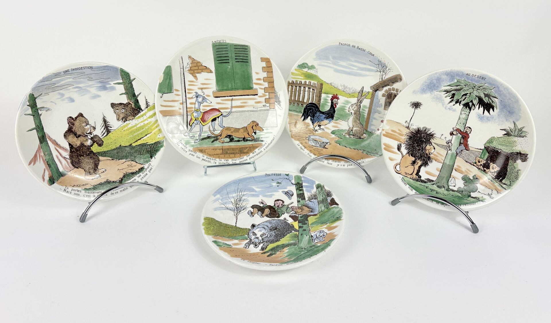 SARREGUEMINES Suite de 5 assiettes en faïence à décor historié polychrome d'animaux parlants