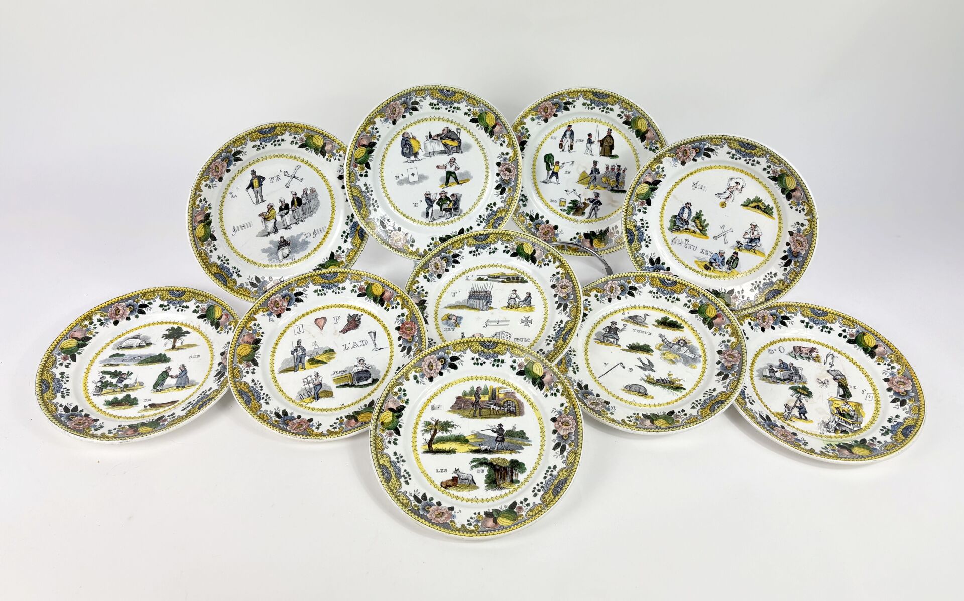 Suite de 10 assiettes en faïence à décor de rebus, le marli à décor de fleurs et fruits polychromes