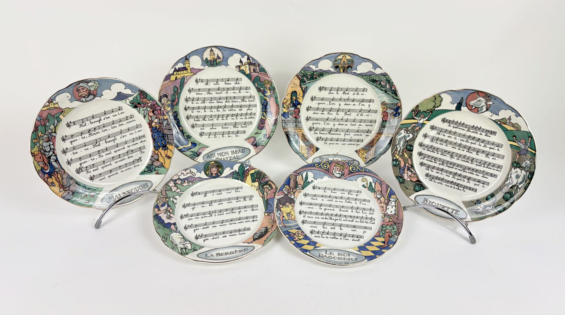 FAYENCERIES DE DIGOIN SARREGUEMINES Modèle Chansons et Rondes de France - Suite de 6 assiettes en faïence dont Le roi Dagobert, Au mon beau château, Biquette
