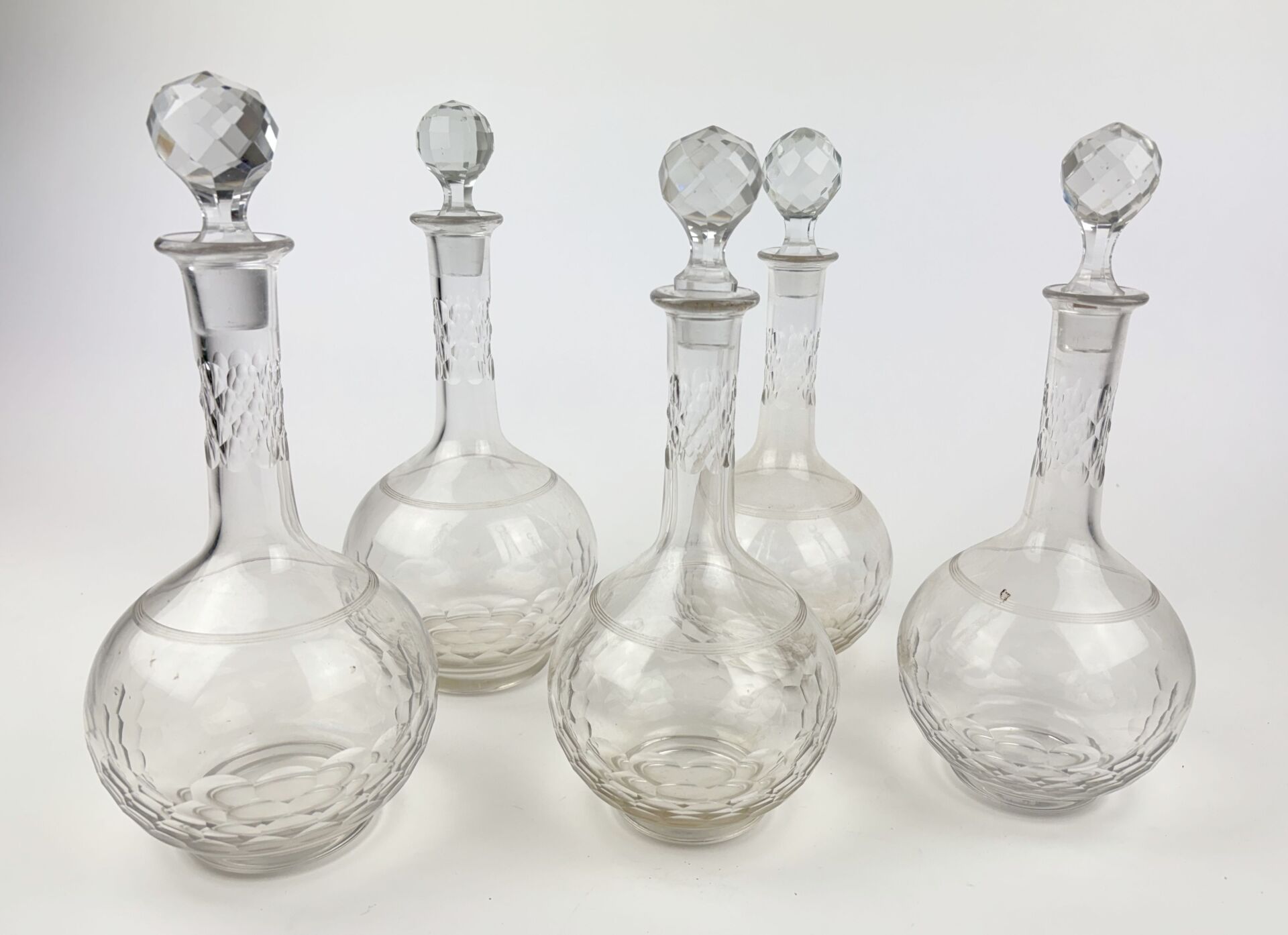 BACCARAT, attribué à Modèle Chauny - Suite de 2 carafes à vin rouge et 3 carafes à vin blanc en cristal taillé à motif nid d'abeille
