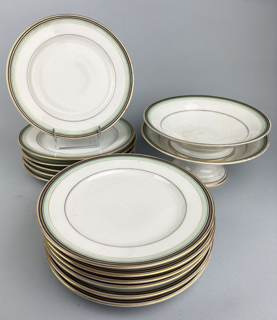 VIEUX PARIS Partie de service à dessert en porcelaine blanche à décor de filets alternés dorés, noir et céladon comprenant : - 12 Assiettes à dessert - 1 Compotier - 1 Coupe sur talon Usure au décor Travail d'époque Napoléon III