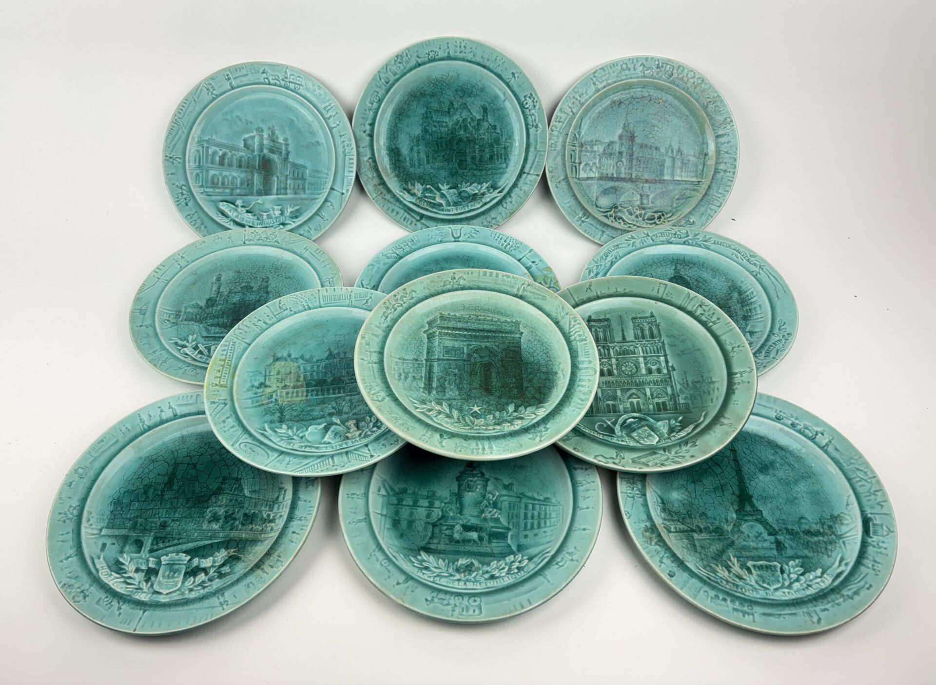 Suite de 12 assiettes en barbotine bleu céladon à décor des monuments de Paris (La tour de 300 mètres, la Place de la République, Le Panthéon, L'Académie de Musique, Notre Dame de Paris, Le Palais du Trocadéro, L'Hotel de Ville, l'Arc de Triomphe, Le Palais