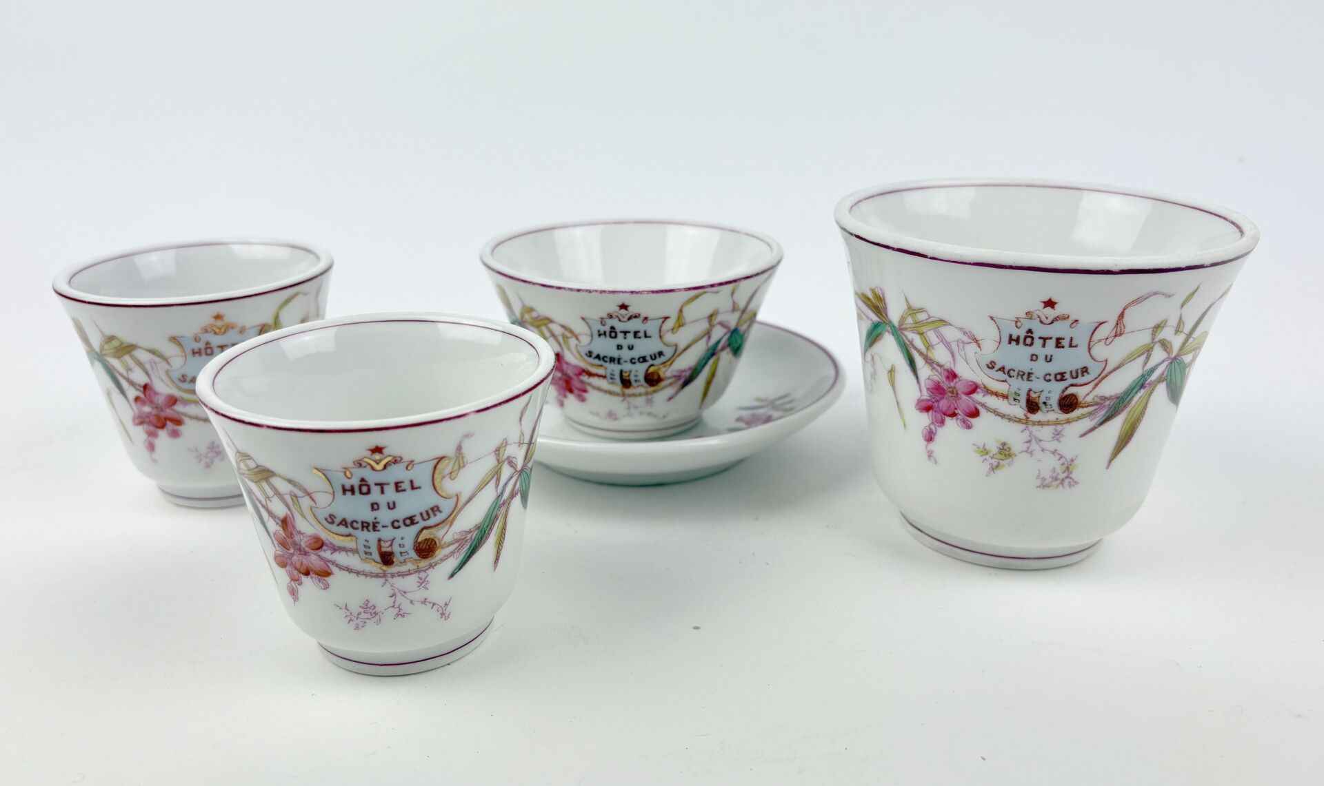 PARIS Ensemble en porcelaine comprenant une tasse à chocolat, deux brulots, une tasse à thé et sa soucoupe à décor floral provenant de l'Hotel du Sacré Coeur