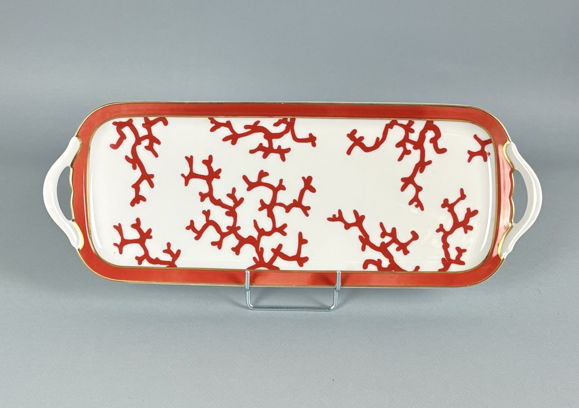 Alberto PINTO (1945-2012) pour RAYNAUD, Limoges Modèle Cristobal - Plat à cake en porcelaine à décor de coraux rehaussés d'or Légère altération de la couleur Dimensions : 39 x 14.5 cm