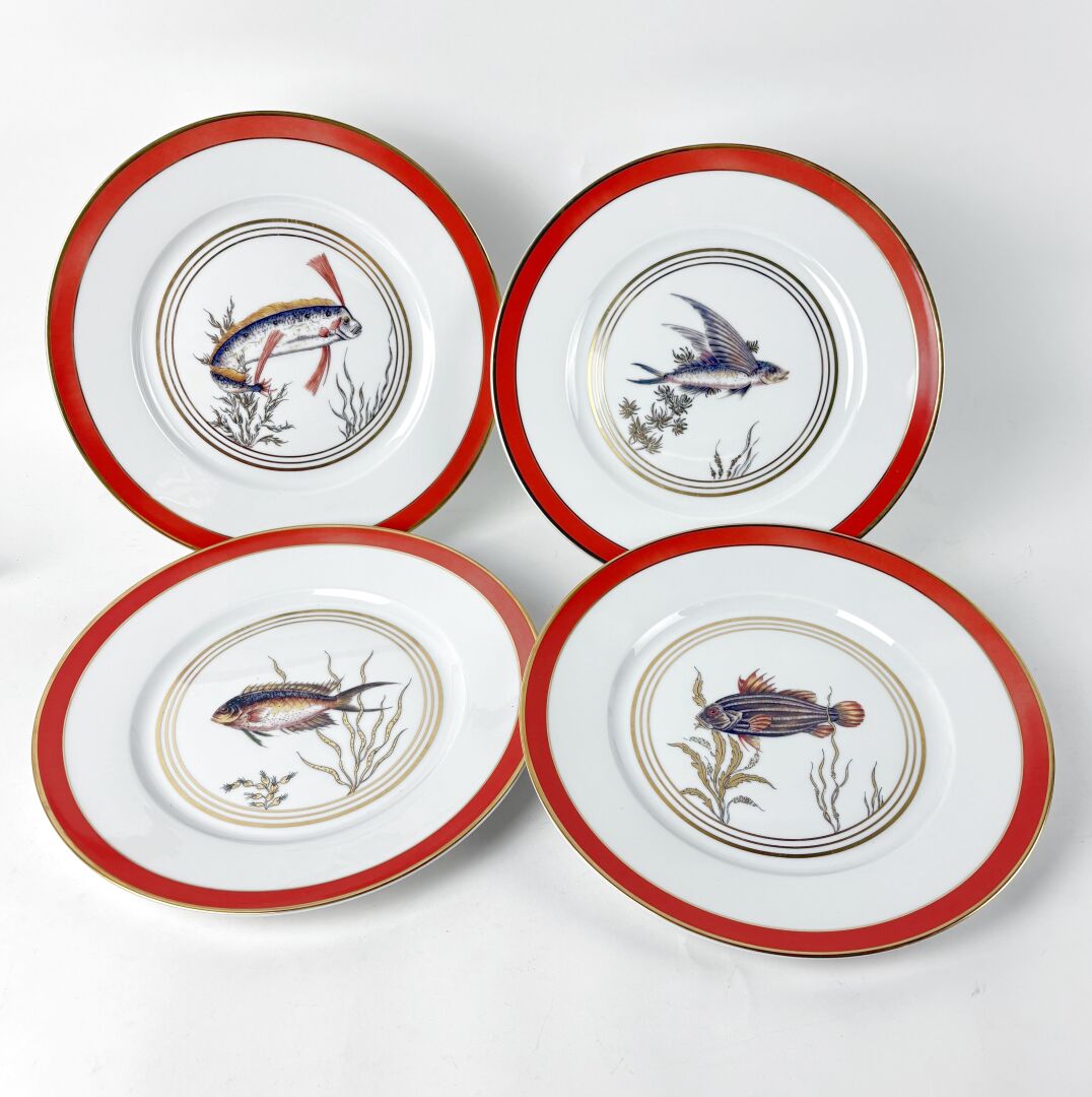 Alberto PINTO (1945-2012) pour RAYNAUD, Limoges Modèle Cristobal (n°4) - Suite de quatre assiettes à poisson en porcelaine à décor polychrome de poissons soulignés de filets corail et doré Dans une boite de la manufacture D : 27.5 cm