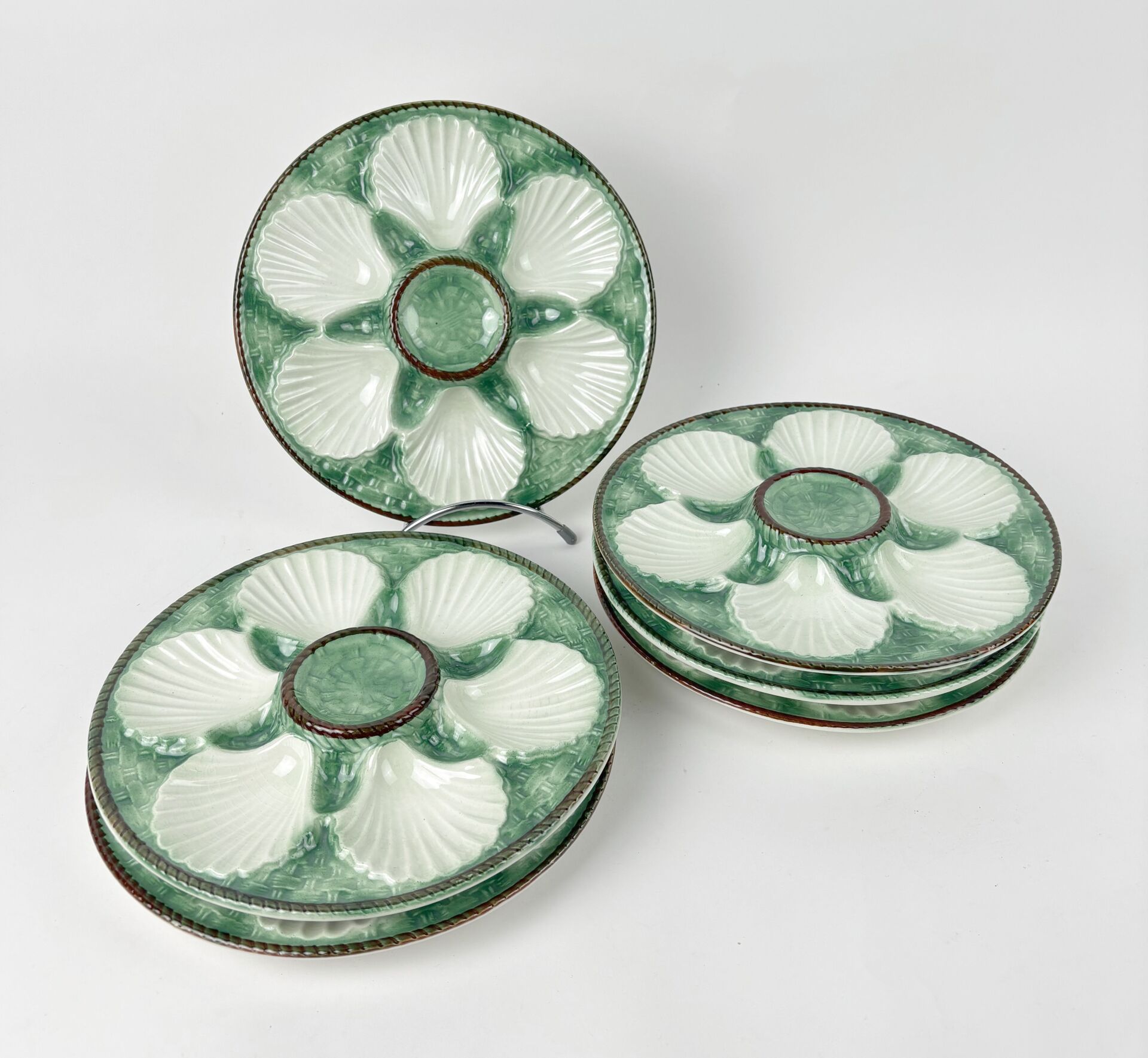 LONGCHAMP, Attribué à Suite de six assiettes à huitres en faïence blanche et verte à décor à l'imitation de la vannerie