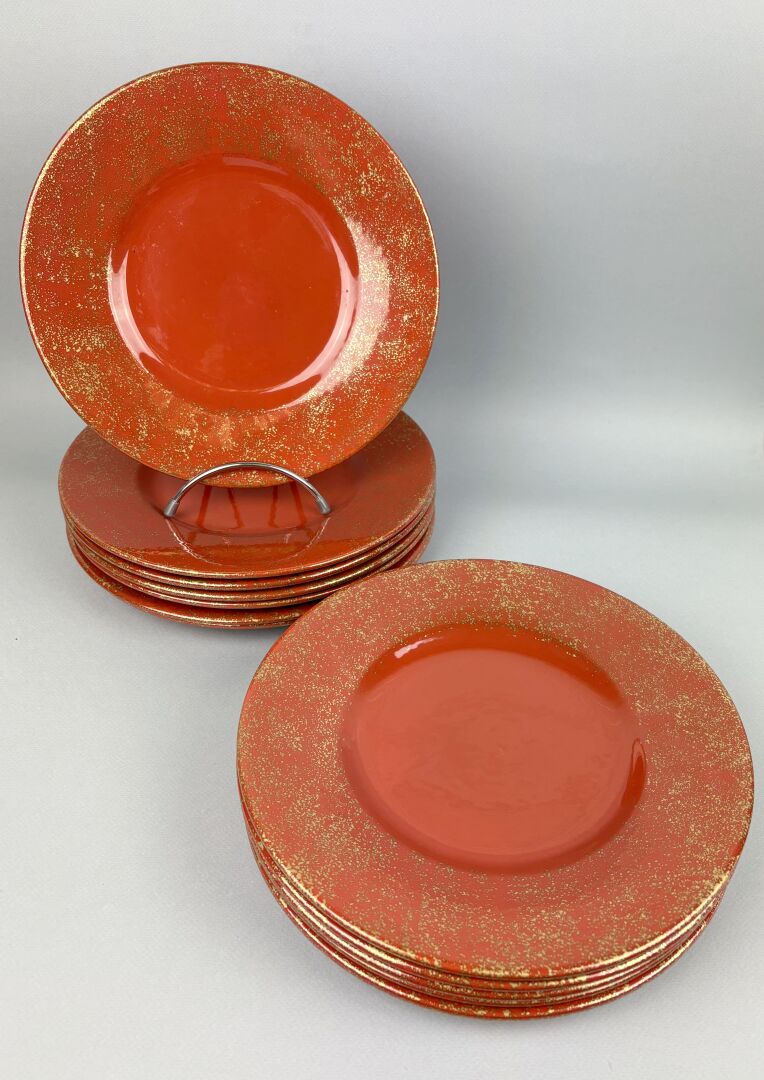 FAIENCERIE DE CHAROLLES Suite de douze assiettes en faïence à engobe corail, le marli à décor moucheté or D : 26.5 cm