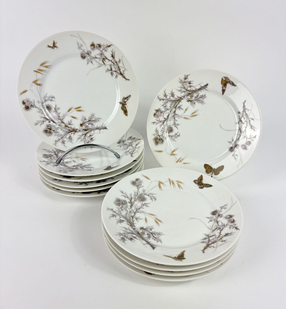 VIEUX PARIS Suite de onze assiettes à dessert en porcelaine à décor de décalcomanie de chardons et papillons Marquées au dos Mansard rue Paradis à Paris Travail vers 1900 D : 21 cm