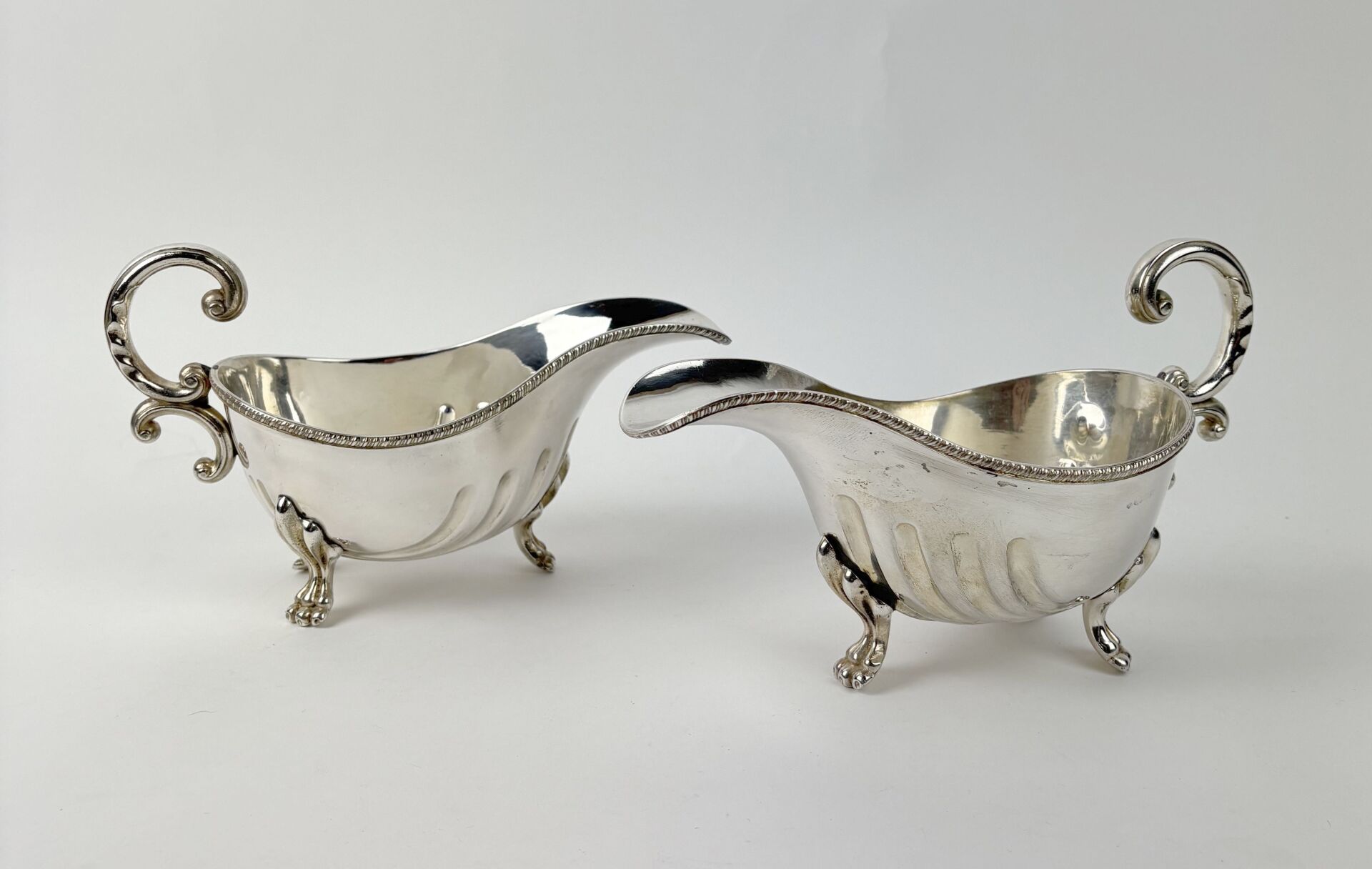 Paire de saucières de service en métal argenté reposant sur un piètement tripode se terminant par des pattes léonines.