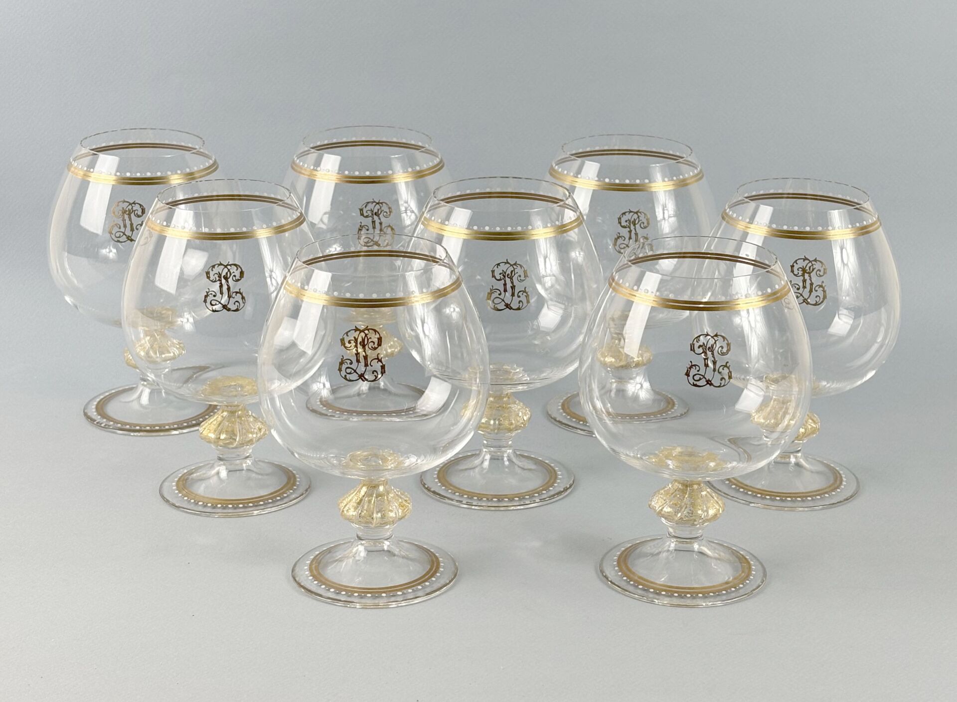 MURANO, Italie Suite de huit verres à cognac en verre soufflé, olive à décor de cotes torses et paillettes dorées, la base et le buvant rehaussés d'un double filet or et d'un rang de pastilles émaillées blanches, chiffrés. H : 15 cm