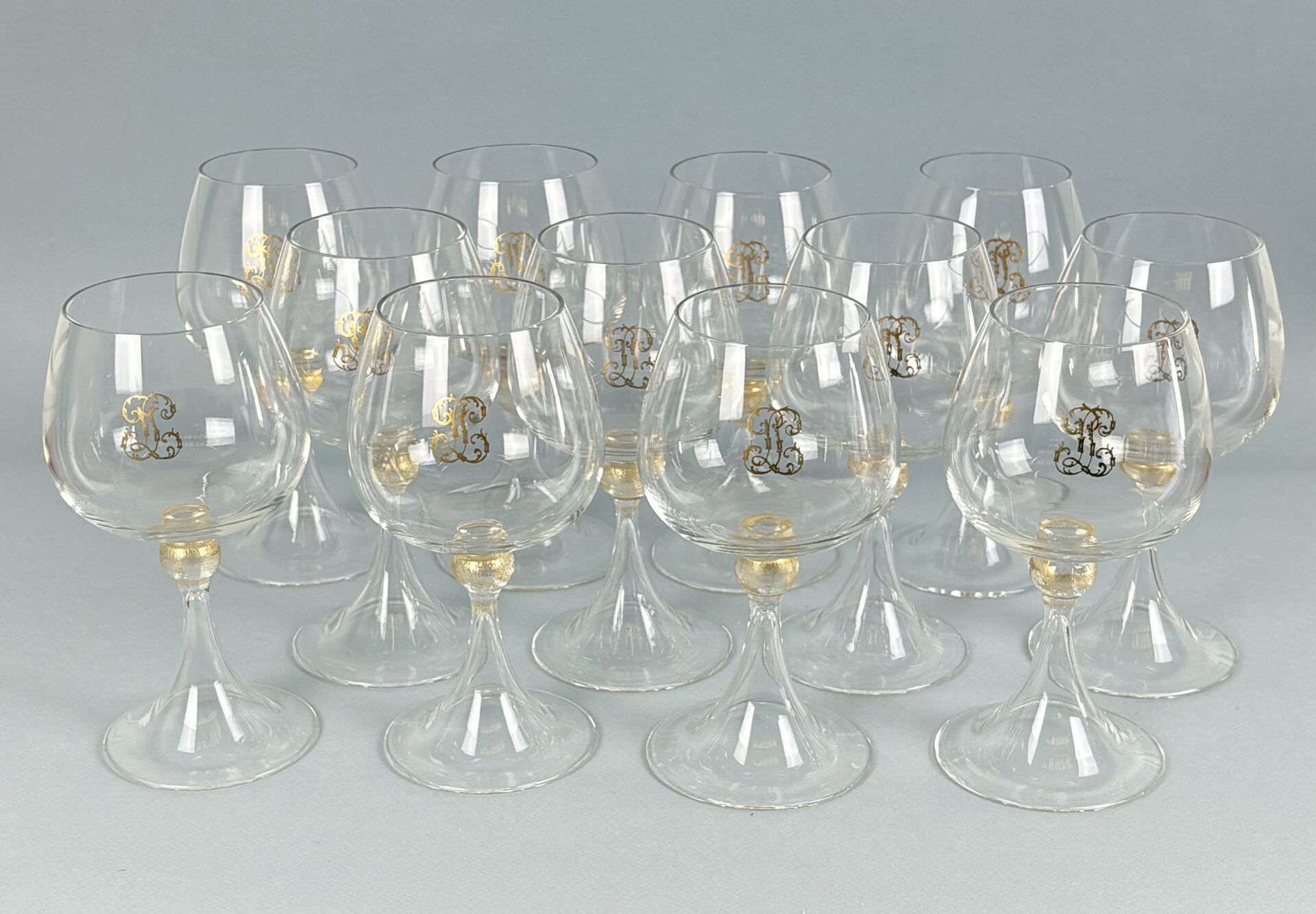 VENISE, XX° Suite de douze grands verres à vin calice en verre soufflé, la jambe surmontée d'une olive partiellement dorée, chiffrés "JL" en lettres d'or H : 17.5 cm