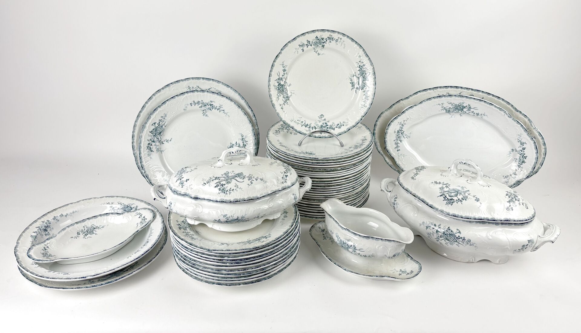 TERRE DE FER Modèle Rochambeau - Partie de service de table en faïence comprenant : - 28 Assiettes plates - 10 Assiettes creuses - 1 Soupière - 1 Légumier - 4 Plats ronds - 2 Plats ovales - 1 Saucière - 1 Ravier