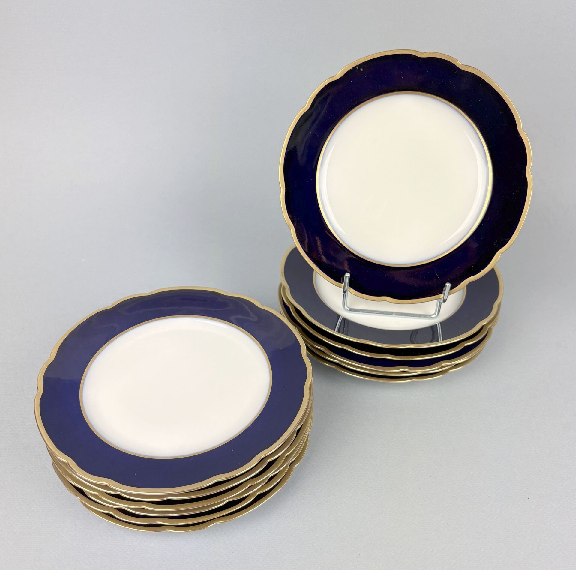 Charles AHRENFELDT, Limoges Suite de 12 assiettes à dessert en porcelaine à bord chantourné, le marli bleu de four encadré de deux filets dorés D : 18.5 cm