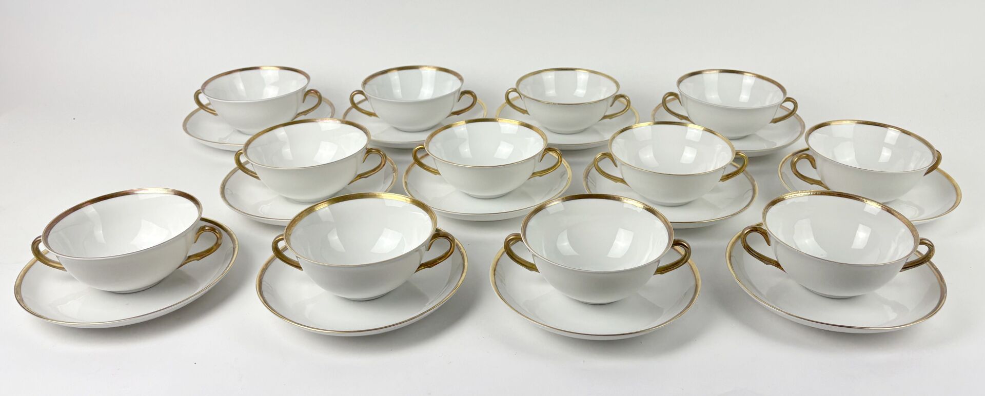 ALLEMAGNE, XX° Suite de dix bols à bouillon en porcelaine blanche à décor de frises et de filets dorés D. Hors anse : 12.3 - H : 5.2 cm