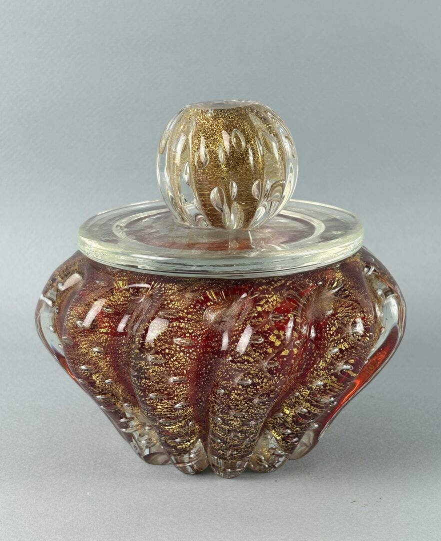 BAROVIER ET TOSO, dans le gout de Coupe en verre soufflé de Murano à décor de bulles sur fond rouge pailleté or. H : 8 - D : 14 cm On y joint le couvercle assorti (légers chocs)