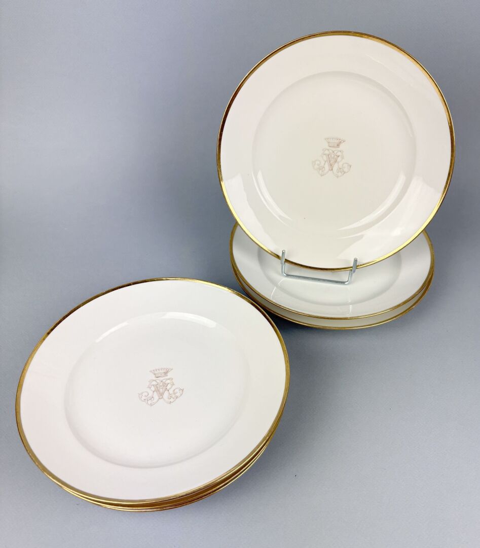 SEVRES Suite de six assiettes en porcelaine blanche à décor de liseré doré centré d'un monogramme sous couronne comtale. Daté Sèvres 1833, 1834 Usure au décor D : 22 cm