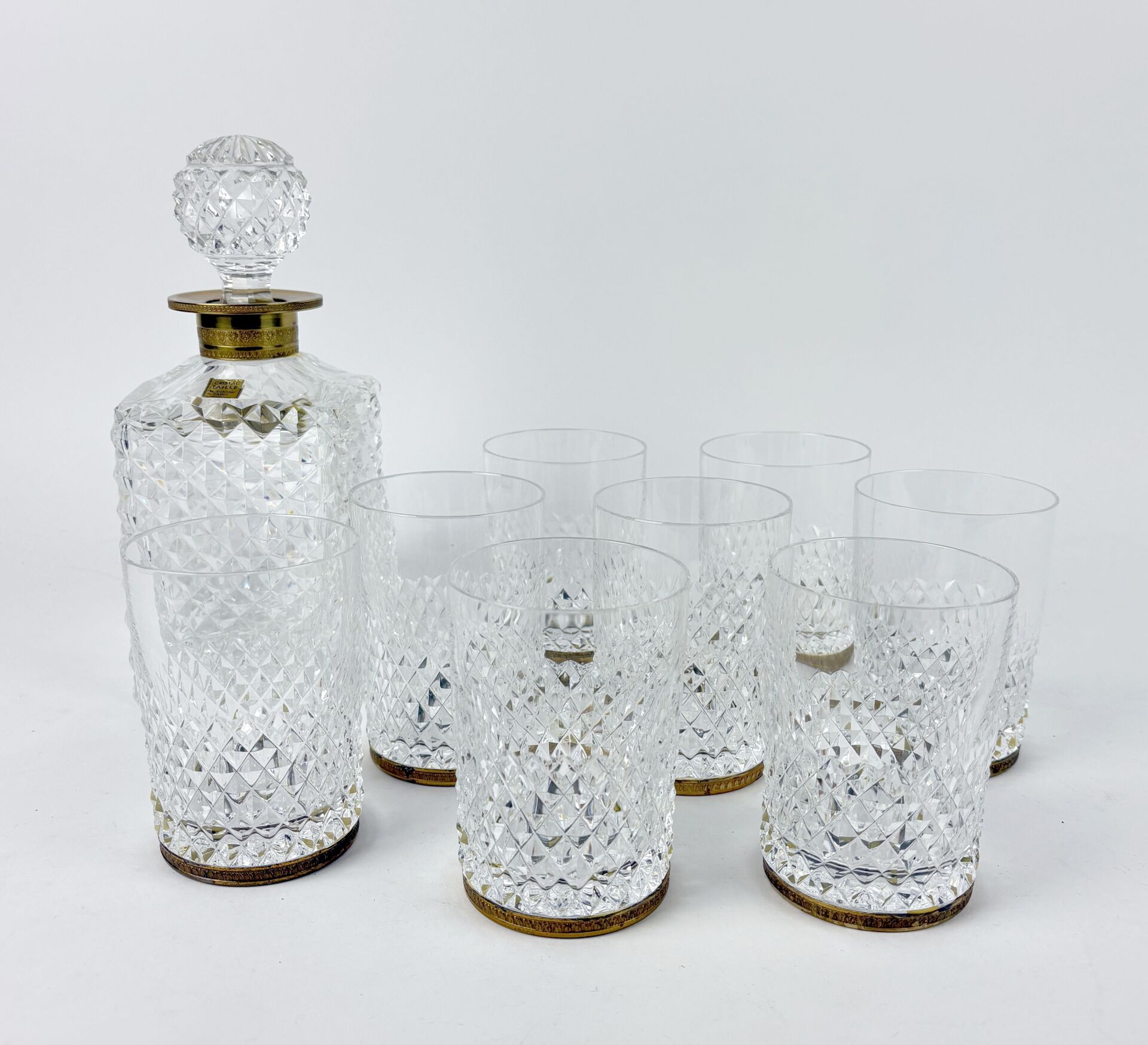 Service de verres taillé et carafe, cerclé métal doré à décor de palmettes
