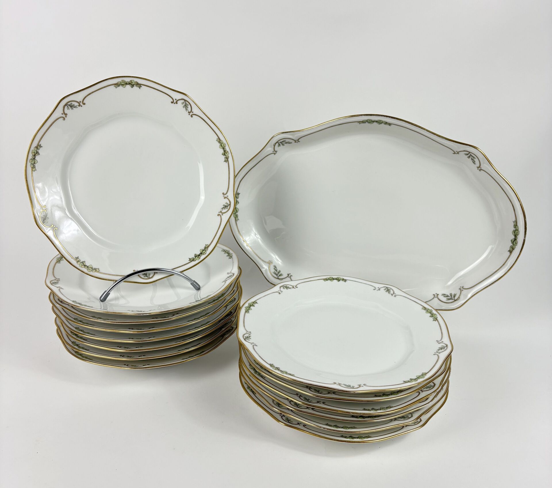 Alfred HACHE à Vierzon Parte de service de table en porcelaine blanche à bord polylobé et décor de branches de Laurier et rubans verts et or comprenant : - 8 Assiettes plates - 9 Assiettes creuses - 1 Plat ovale Travail vers 1900