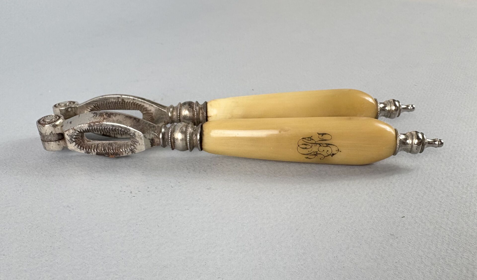 Casse noix en métal argenté et corne chiffré Oxydations Travail XIX°