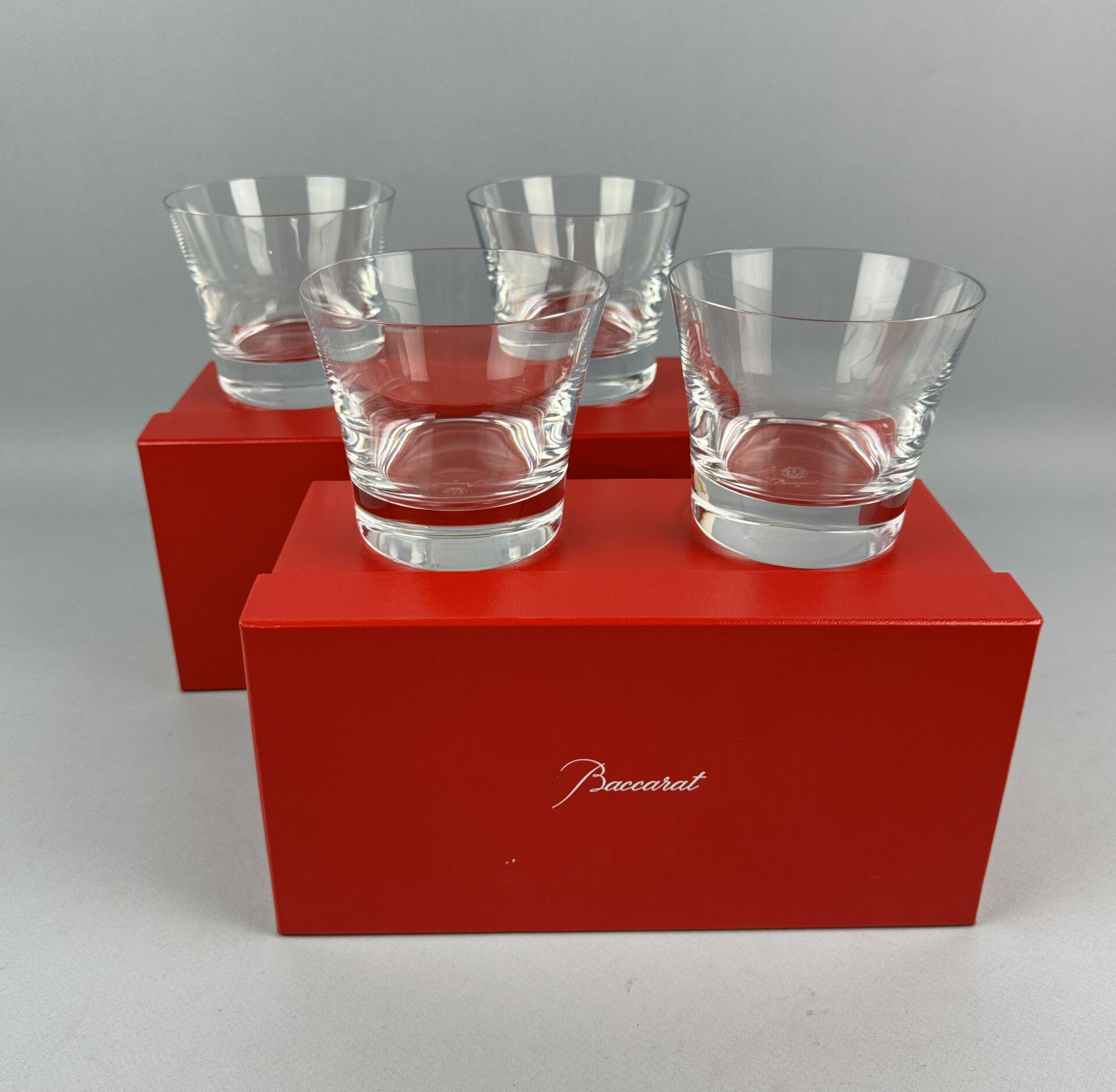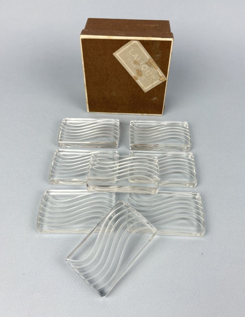 LALIQUE Suite de huit larges porte-couteaux en cristal à décor gravé de vagues Signature gravée Lalique France Travail vers 1930 - 1940 Dans leur boite Dimensions : 5 x 8.5 cm