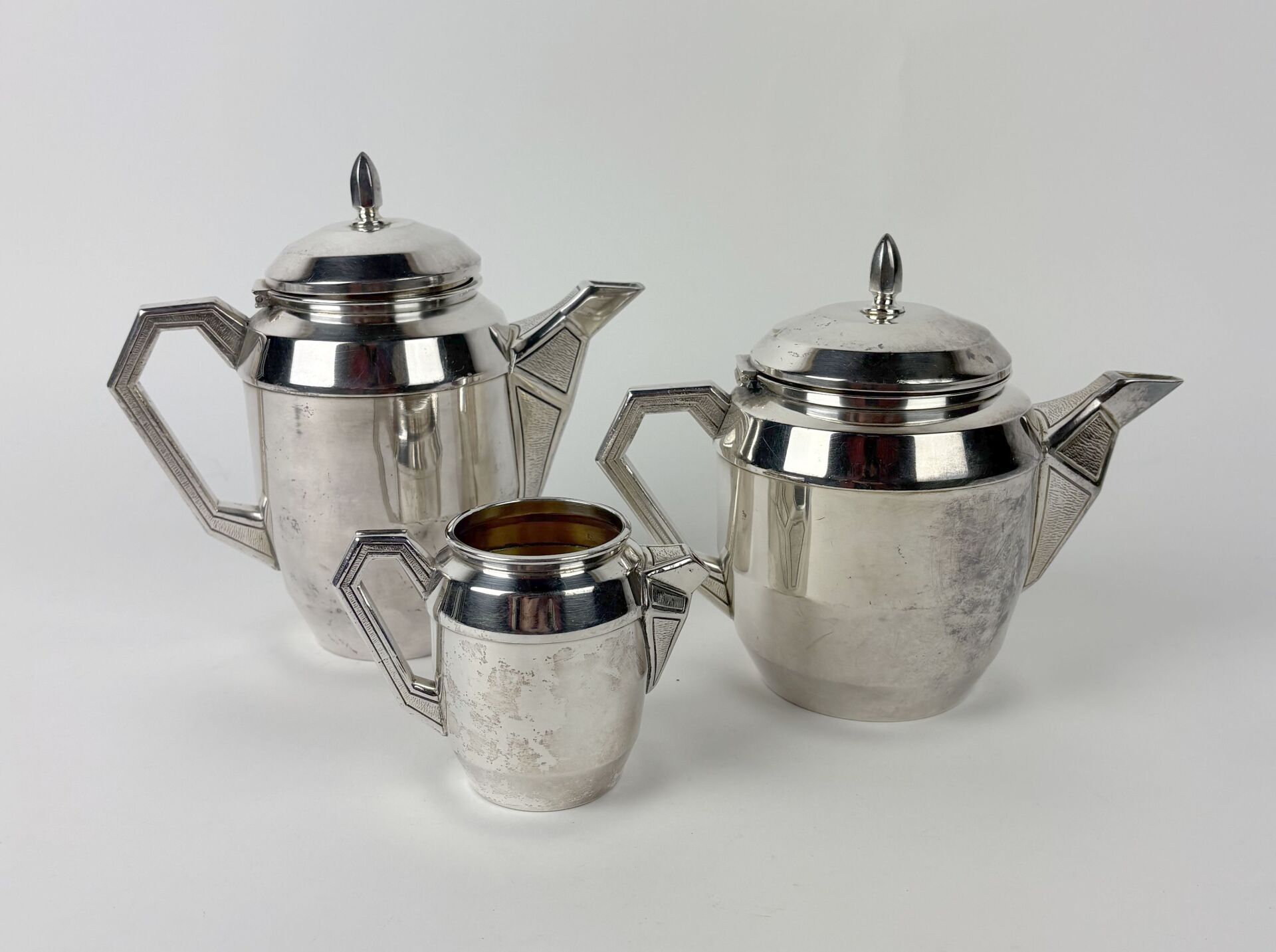 Service à thé et café en métal argenté de style Art Déco comprenant une cafetière, une théière et un pot à lait.