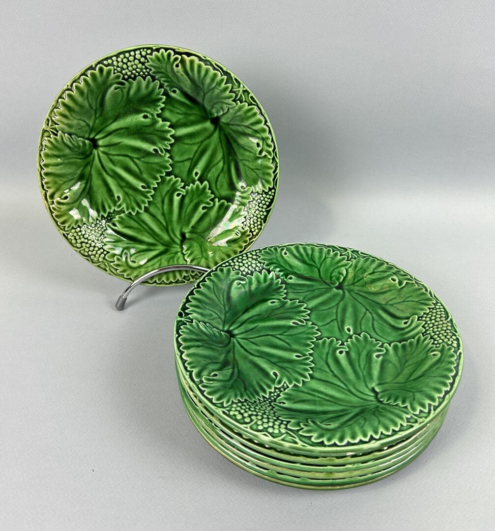 LONGCHAMP, Attribué à Suite de six assiettes à huitres en faïence blanche et verte à décor à l'imitation de la vannerie