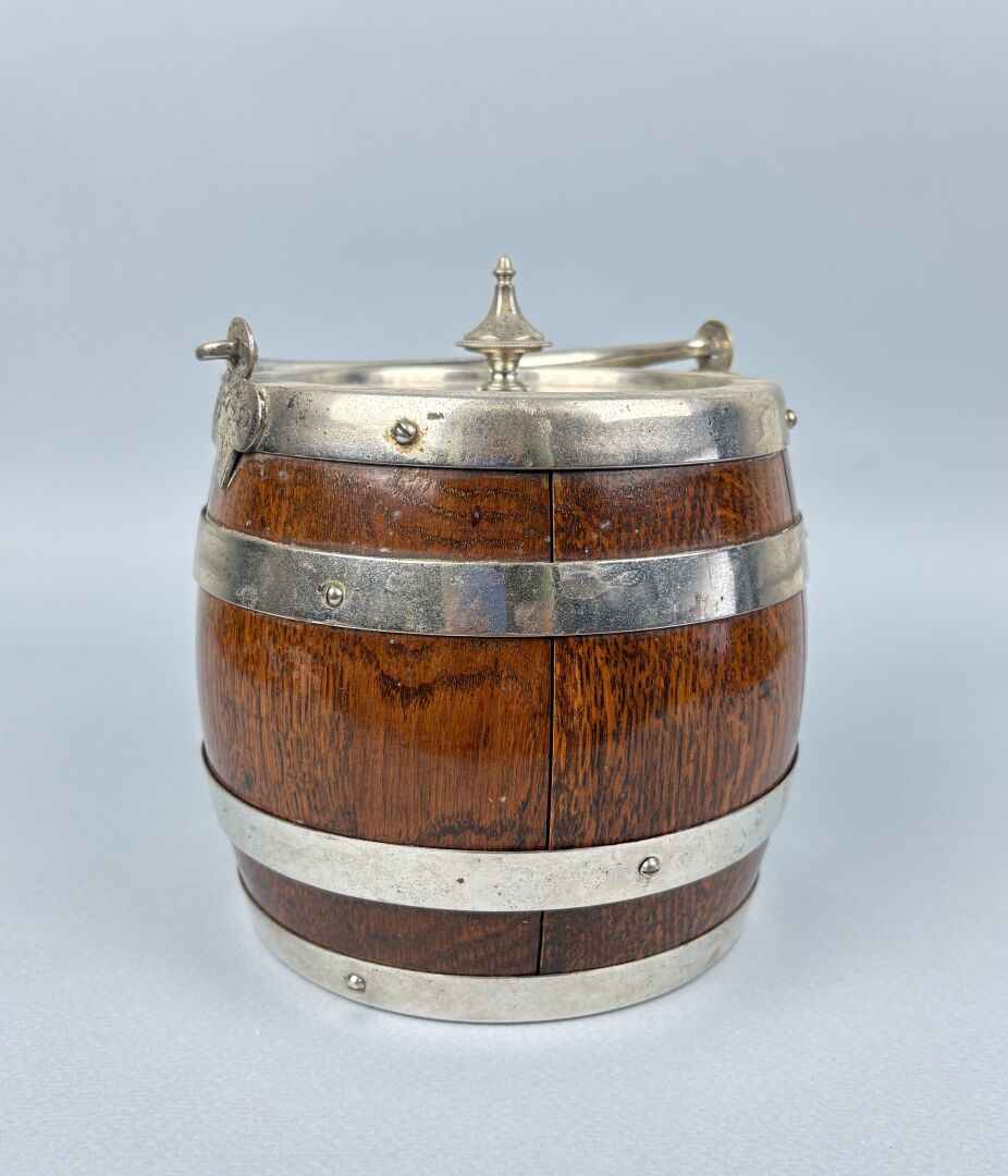 Seau à glaçons anglais en métal argenté et bois, l'intérieur en porcelaine figurant un tonneau avec une anse, flanqué d'un blason. H : 15 cm