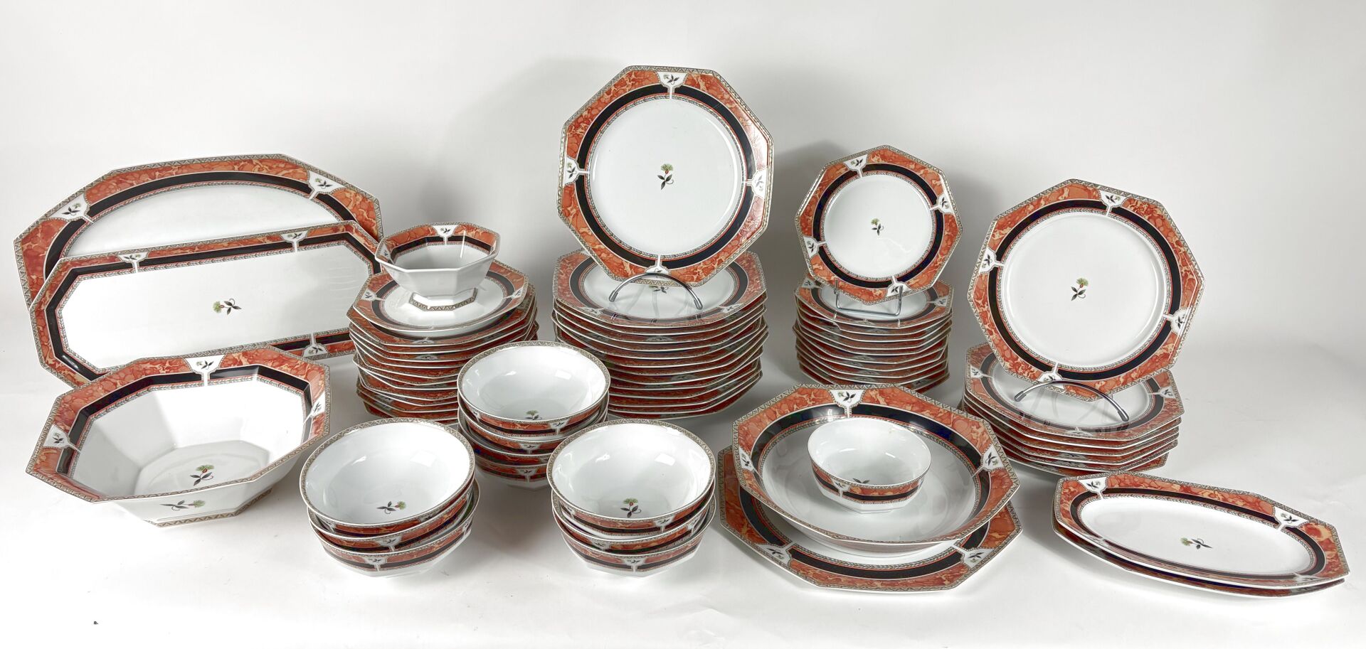 ANCIENNE MANUFACTURE ROYALE, Limoges Modèle Hadrien - Partie de service de table en porcelaine octogonales émaillée polychrome et or, figurant les marbres et les fastes de la villa d'Hadrien comprenant : - 14 Assiettes de table (D : 25 cm) - 7 Assiettes à salade (D :