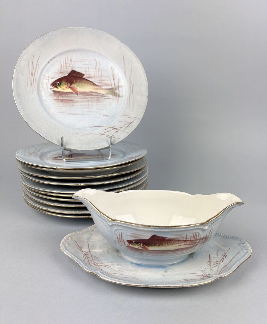 G.D.A France Partie de service à poisson en porcelaine à bord polylobé à décor peint de poissons d'eau douce comprenant : - 11 Assiettes - 1 Saucière Légères usures au décor D : 22 cm