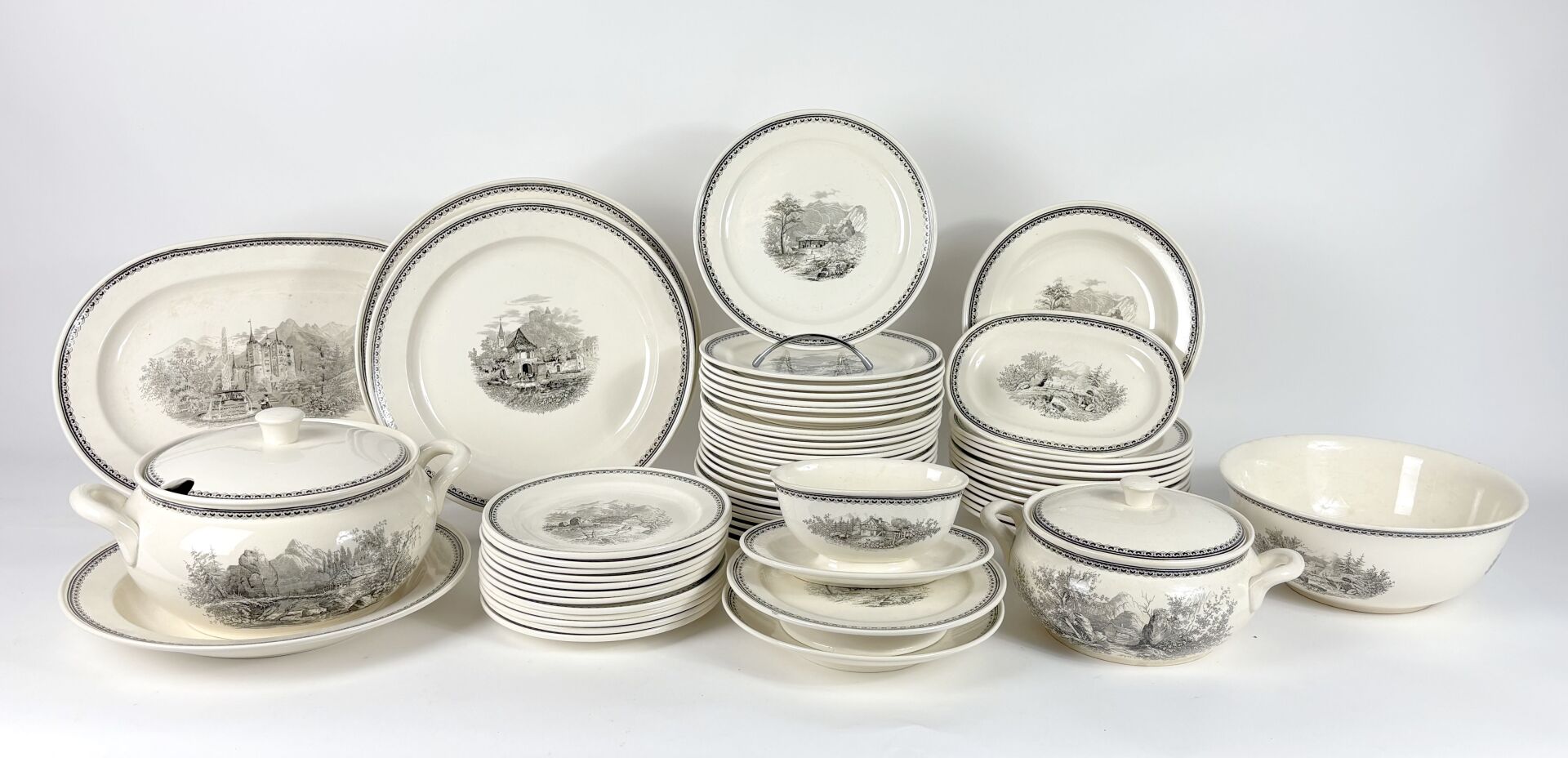 VILLEROY & BOCH Modèle Alpina - Partie de service de table en faïence crème à décor en grisaille de paysages de montagne (nombreux décors) comprenant : - 24 Assiettes plates - 12 Assiettes creuses - 12 Assiettes à dessert - 1 Soupière - 1 Légumier - 1 Saladier
