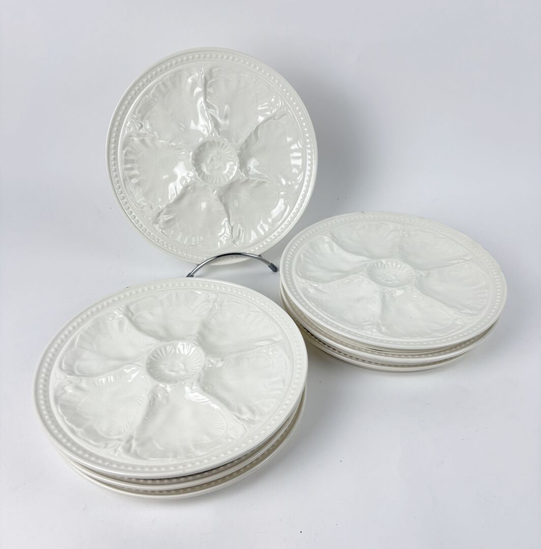 GIEN Suite de sept assiettes à huitres en faïence blanche