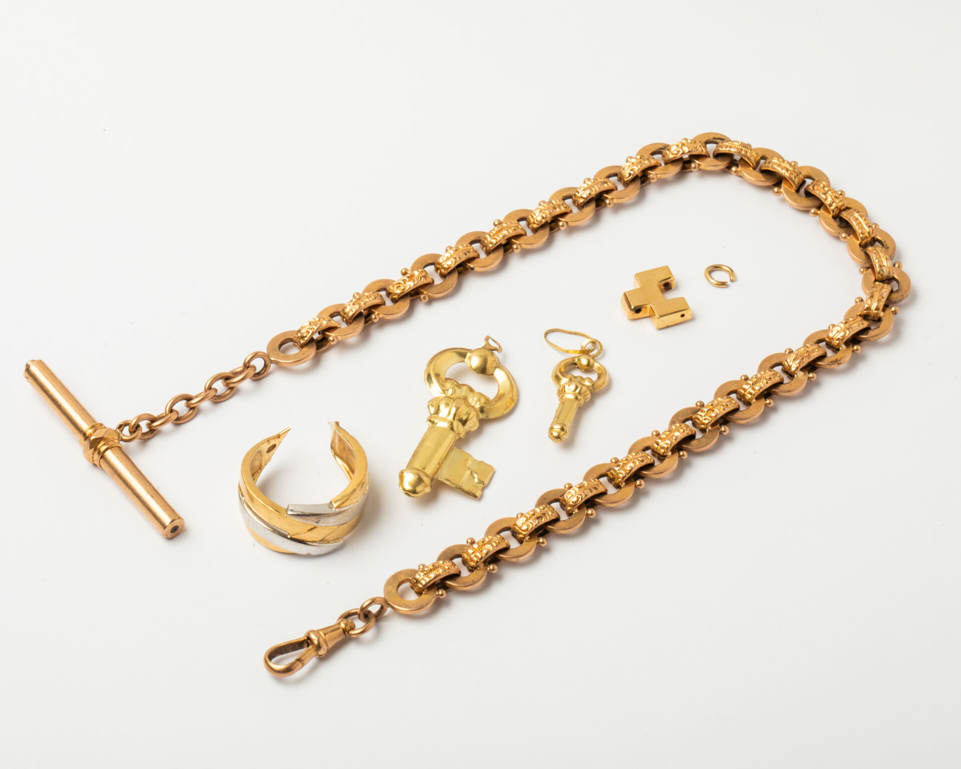 Ensemble en or jaune (750 millièmes) comprenant : - 1 Chaine de montre de gousset - 1 Bague balmain coupée - 2 Pendentifs clef - Un maillon de montre et un anneau Poids Brut : 38.7 g. On y joint un ensemble en métal doré comprenant