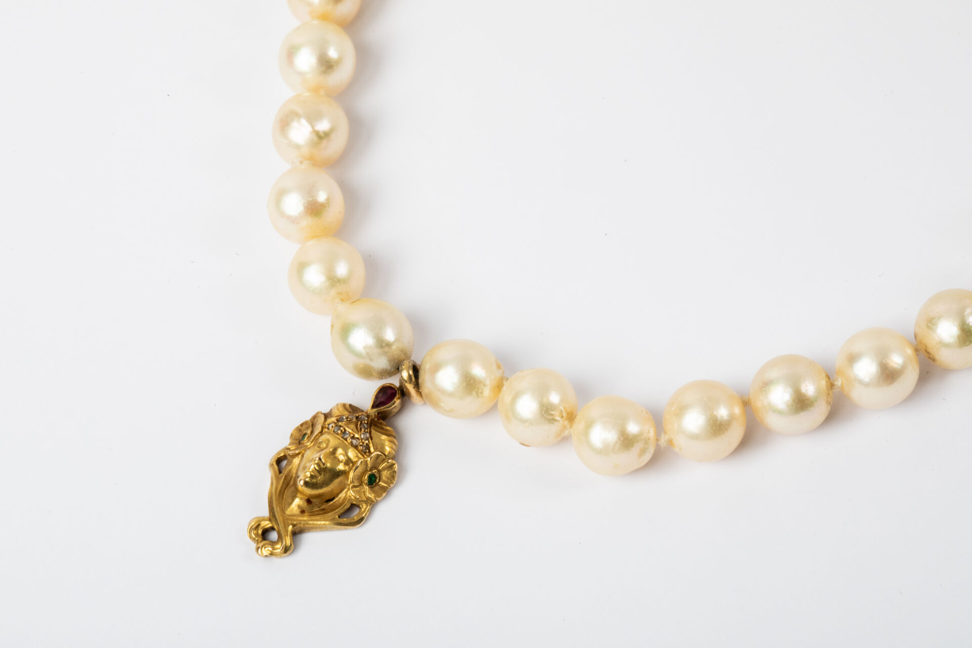 Collier de perles de culture choker. Fermoir plaque chiffré en or 585 millièmes (14k). Motif Art Nouveau en or 750 millièmes (18k) avec émeraudes, rubis et diamants. Longueur : 48 cm. Poids estimé du femoir : 4 g